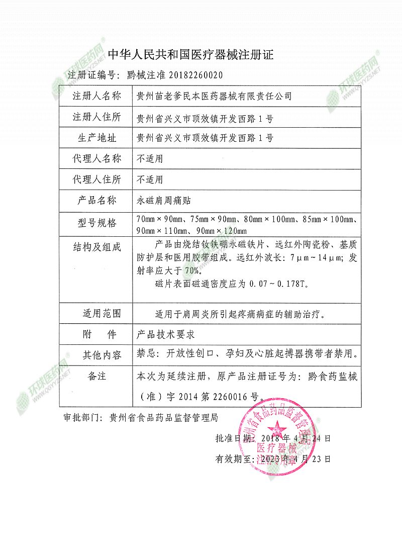 | 補(bǔ)充說明 | 1、使用本品,若個別皮膚出現(xiàn)瘙癢或皮疹,應(yīng)立即停止使用即可。 2、使用或存放本品時應(yīng)遠(yuǎn)離磁卡和易受磁損壞物品;不要與帶金屬儀表的器械同時使用。 3、開放性傷口、孕婦、兒童、心臟起搏器攜帶者和對磁療有明顯不良反應(yīng)者禁用。 4、置于干燥通風(fēng)處保存。 【售后服務(wù)單位】貴州苗老爹民本醫(yī)藥器械有限責(zé)任公司 【注冊人住所】貴州省興義市頂效鎮(zhèn)開發(fā)西路1號 |