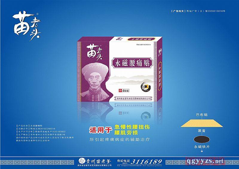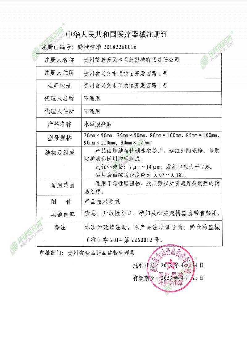 | 補(bǔ)充說(shuō)明 | 1、使用本品,若個(gè)別皮膚出現(xiàn)瘙癢或皮疹,應(yīng)立即停止使用即可。 2、使用或存放本品時(shí)應(yīng)遠(yuǎn)離磁卡和易受磁損壞物品;不要與帶金屬儀表的器械同時(shí)使用。 3、開(kāi)放性傷口、孕婦、兒童、心臟起搏器攜帶者和對(duì)磁療有明顯不良反應(yīng)者禁用。 4、置于干燥通風(fēng)處保存。 【售后服務(wù)單位】貴州苗老爹民本醫(yī)藥器械有限責(zé)任公司 【注冊(cè)人住所】貴州省興義市頂效鎮(zhèn)開(kāi)發(fā)西路1號(hào) |