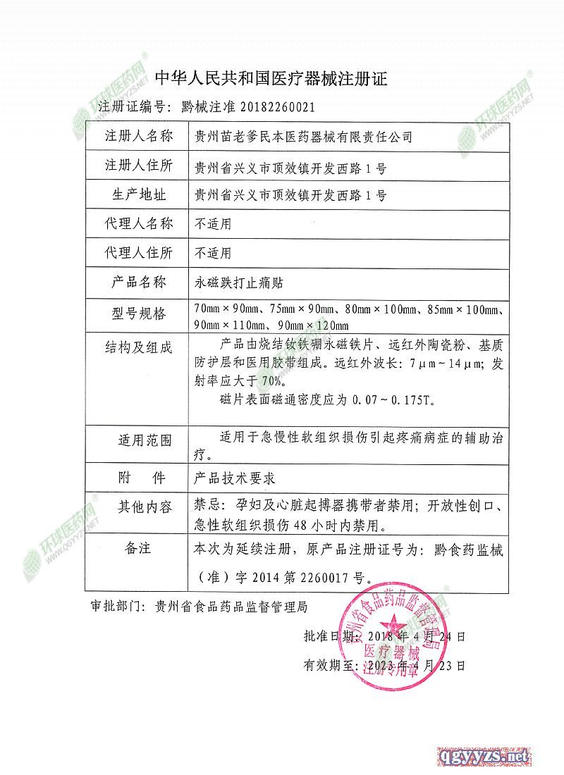 | 補(bǔ)充說(shuō)明 | 1、使用本品,若個(gè)別皮膚出現(xiàn)瘙癢或皮疹,應(yīng)立即停止使用即可。 2、使用或存放本品時(shí)應(yīng)遠(yuǎn)離磁卡和易受磁損壞物品;不要與帶金屬儀表的器械同時(shí)使用。 3、開放性傷口、孕婦、兒童、心臟起搏器攜帶者和對(duì)磁療有明顯不良反應(yīng)者禁用。 4、置于干燥通風(fēng)處保存。 【售后服務(wù)單位】貴州苗老爹民本醫(yī)藥器械有限責(zé)任公司 【注冊(cè)人住所】貴州省興義市頂效鎮(zhèn)開發(fā)西路1號(hào) |