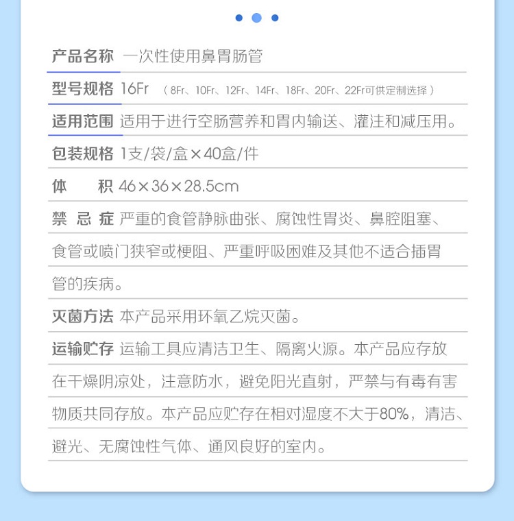| 產(chǎn)品用途 | 適用于進(jìn)行空腹?fàn)I養(yǎng)和胃內(nèi)輸送、灌注和減壓用 |