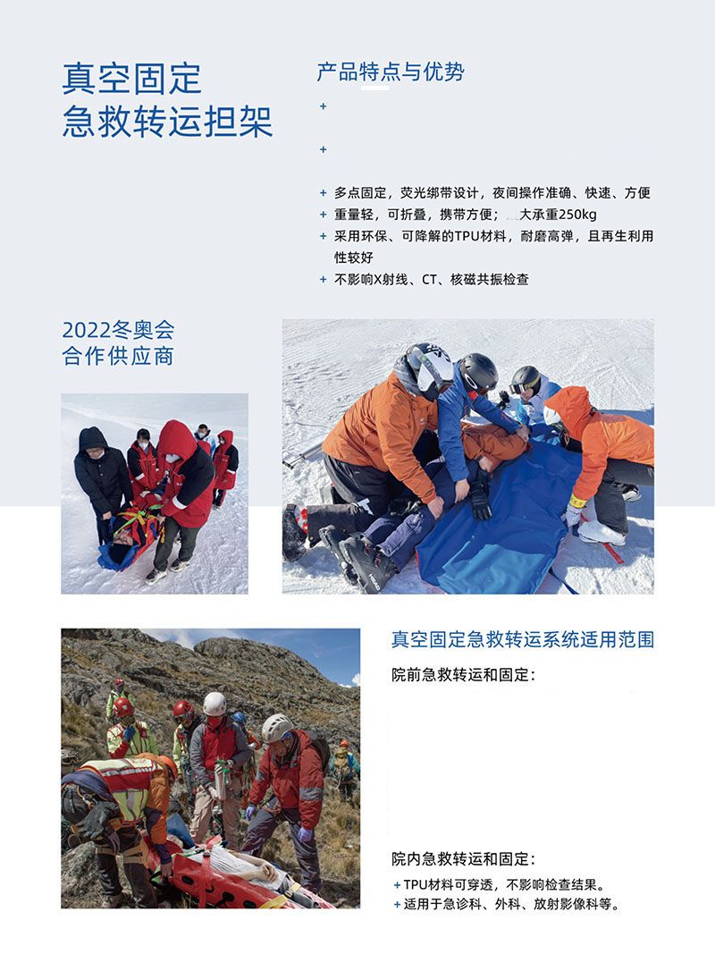 產(chǎn)品用途 真空固定夾板利用真空原理,將夾板內(nèi)空氣抽出,使產(chǎn)品根據(jù)被包裹后的受傷者的身體輪廓快速硬化、塑型,從而支撐和加固受傷者全身或受傷身體部分,在避免發(fā)生二次損傷的情況下方便搬動和轉(zhuǎn)運受傷者;