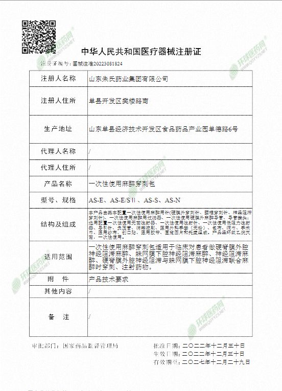 | 補(bǔ)充說明 | 本產(chǎn)品由基本配置一次性使用麻醉用針(硬膜外穿刺針、腰椎穿刺針、神經(jīng)阻滯穿刺針)、一次性使用麻醉用過濾器、一次性使用硬膜外麻醉導(dǎo)管、導(dǎo)管接頭;選用配置一次性使用無菌注射器、一次性使用注射針、一次性使用低阻力注射器、導(dǎo)引針、負(fù)壓管、消毒液刷、醫(yī)用外科手套(無粉)、包布、洞巾、手術(shù)巾、醫(yī)用紗布、創(chuàng)口貼、醫(yī)用膠帶、固定圓片和托盤組成。產(chǎn)品經(jīng)環(huán)氧乙烷滅菌,一次性使用。 |