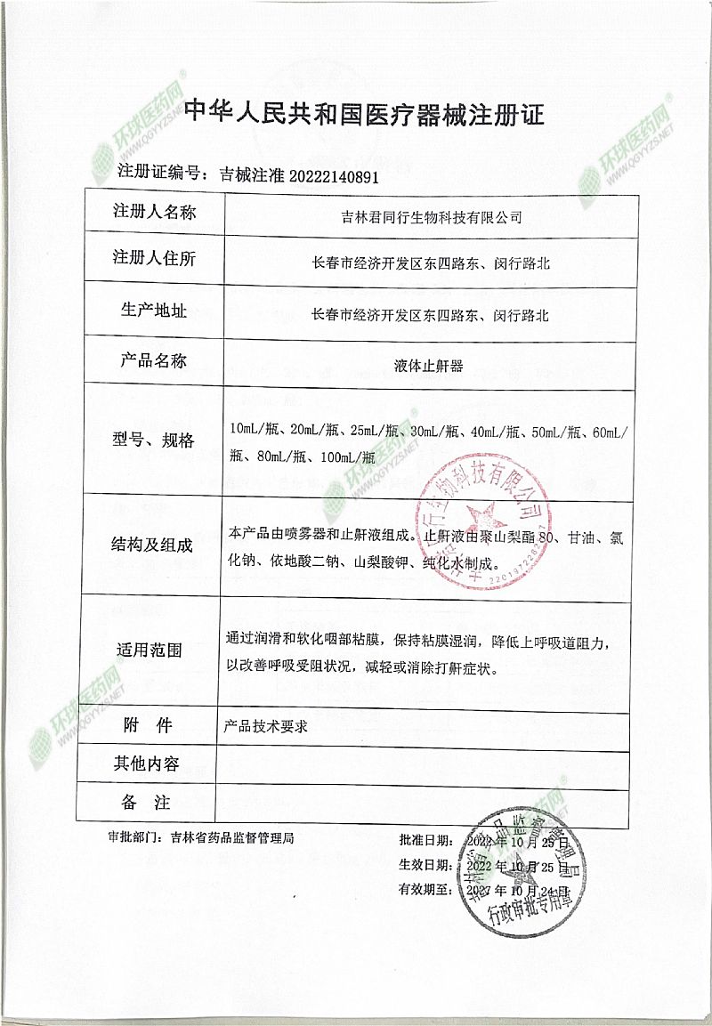 | 產(chǎn)品用途 | 用于減輕打鼾癥狀。 |