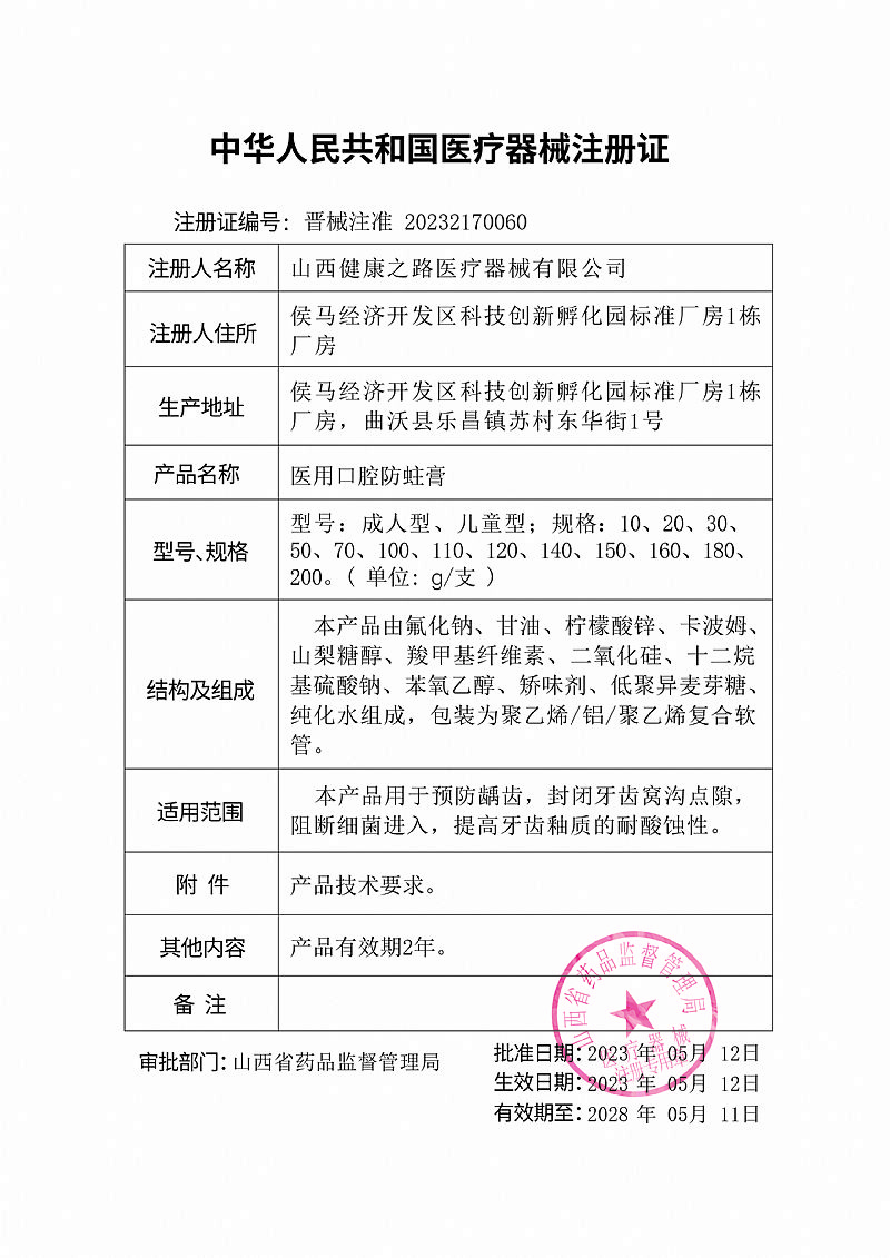 | 補(bǔ)充說明 | 【產(chǎn)品名稱】醫(yī)用口腔防蛀膏 【型號(hào)】成人型 【規(guī)格】10g/支、20g/支、30g/支、50g/支、70g/支、100g/支、110g/支、120g/支、140g/支、150g/支、160g/支、180g/支、200g/支。 【結(jié)構(gòu)及組成】本產(chǎn)品由氟化鈉、甘油、檸檬酸鋅、卡波姆、山梨糖醇、羧甲基纖維素、二氧化硅、十二烷基硫酸鈉、苯氧乙醇、矯味劑、低聚異麥芽糖、純化水組成,包裝為聚乙烯/鋁/聚乙烯復(fù)合軟管。 【適用范圍】本產(chǎn)品用于預(yù)防齲齒,封閉牙齒窩溝點(diǎn)隙,阻斷細(xì)菌進(jìn)入,提高牙齒釉質(zhì)的耐酸蝕性。 【產(chǎn)品性能】pH值范圍為5.5~8.5;重金屬含量(以Pb計(jì))應(yīng)小于20μg/g;砷含量應(yīng)小于5μg/g。細(xì)菌菌落總數(shù)(cfu/g)≤500,霉菌和酵母菌總數(shù)(cfu/g)≤100,大腸埃希菌(1g)、金黃色葡萄球菌(1g)、銅綠假單胞菌(1g)不得檢出。 【使用方法】 取本品涂于患處保持3-5分鐘或用牙刷蘸取本品刷洗3-5分鐘,后用清水漱口。每次用量1-1.25g(約1cm長),每日2次。 【禁 忌 癥】 1.對(duì)檸檬酸鋅過敏者、對(duì)本品其他成分過敏者禁用。 2.嚴(yán)重肝腎功能不全者禁用。 3.孕婦禁用。 4.3歲以下兒童禁用 【注意事項(xiàng)】 1.本品為外用品,禁止內(nèi)服,不使用切勿打開。 2.置于兒童不易觸及到的地方。 3.患有牙齦潰瘍或口腔炎慎用。 4.切勿接觸眼睛,如接觸眼睛,請用大量清水沖洗。 5.請勿吞食,如被吞食,請用大量清水漱口,并喝大量清水,及時(shí)就醫(yī)。 6.如用后患處感覺不適,應(yīng)暫停使用,癥狀消失后可以繼續(xù)使用。 7.本品性狀發(fā)生改變時(shí)禁止使用。 8.兒童必須在成人監(jiān)護(hù)下使用。 9.如正在使用其他藥品,使用本品前請咨詢醫(yī)師或藥師。 10.使用前請閱讀說明書,在產(chǎn)品有效期內(nèi)使用,超過有效期禁止使用。 11.使用前確認(rèn)包裝是否完整,如遇破損,切勿使用。 12.本品極少發(fā)生過敏反應(yīng),一旦出現(xiàn)過敏反應(yīng),應(yīng)停用本品。 13.產(chǎn)品應(yīng)在專業(yè)醫(yī)師指導(dǎo)下使用。 14.請?jiān)?0天內(nèi)用完,并且每次使用后擰緊蓋子。 【儲(chǔ)存方法】應(yīng)貯存在通風(fēng)干燥處,無腐蝕性氣體和通風(fēng)良好的室內(nèi)。 【運(yùn)輸】產(chǎn)品在運(yùn)輸過程中應(yīng)避免日曬、雨淋及重壓。 【配件清單】醫(yī)用口腔防蛀膏、說明書。 【有效期】 二年 【生產(chǎn)日期/生產(chǎn)批號(hào)】見外包裝 【醫(yī)療器械生產(chǎn)許可證編號(hào)】晉藥監(jiān)械生產(chǎn)許20200012號(hào) 【醫(yī)療器械注冊證編號(hào)】晉械注準(zhǔn)20232170060 【醫(yī)療器械產(chǎn)品技術(shù)要求編號(hào)】晉械注準(zhǔn)20232170060 【注冊人名稱/生產(chǎn)企業(yè)】山西健康之路醫(yī)療器械有限公司 |