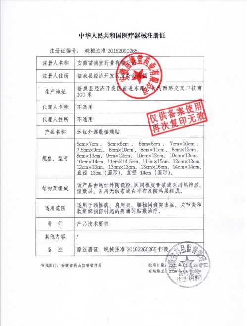 | 產(chǎn)品用途 | 適用于頸椎病、肩周炎、腰椎間盤突出癥,關(guān)節(jié)炎和軟組織損傷引起的疼痛的貼敷治療。 |