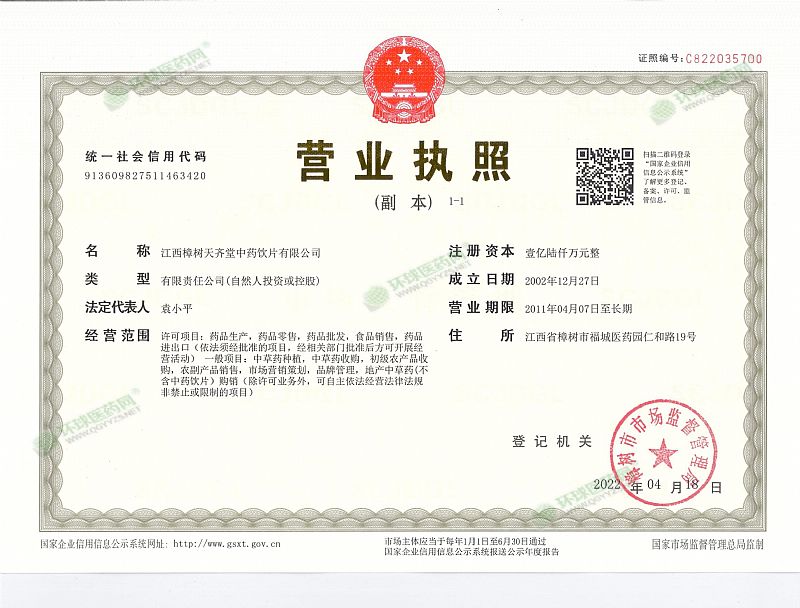 生產(chǎn)企業(yè): 江西樟樹天齊堂中藥飲片有限公司