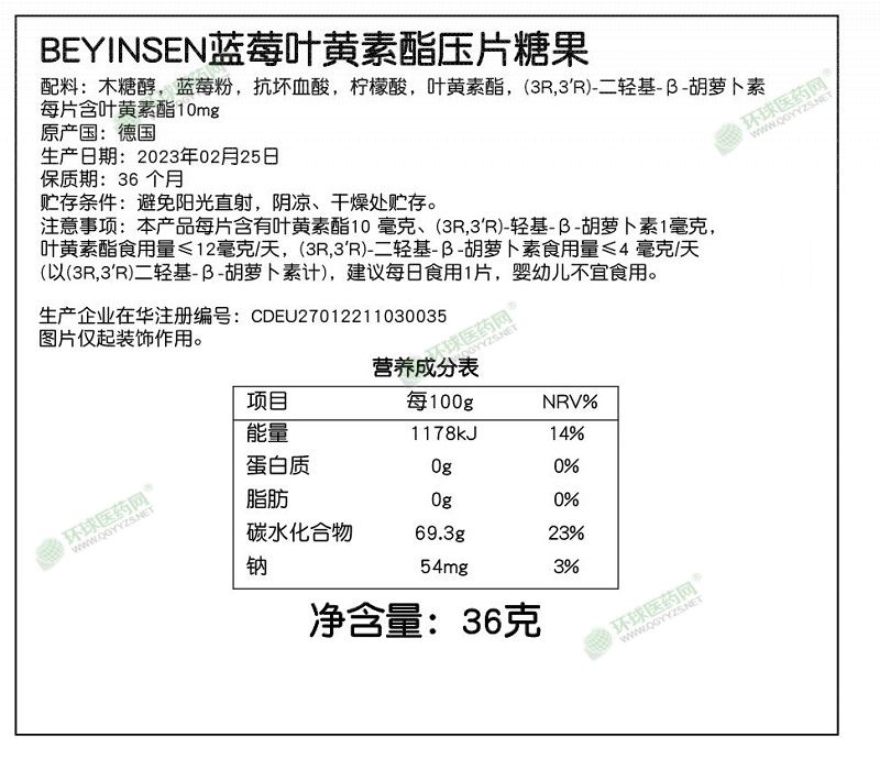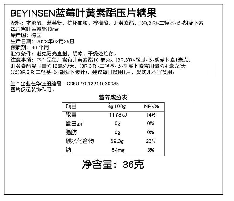 | 補(bǔ)充說明 | 進(jìn)口藍(lán)莓葉黃素脂片 BEYINSEN藍(lán)莓葉黃素酯壓片糖果 配料:木糖醇,藍(lán)莓粉,抗壞血酸,檸檬酸,葉黃素酯,(3R.3'R)-二輕基-3-胡蘿卜素 每片含葉黃素酯10mg 原產(chǎn)國:德國 生產(chǎn)日期: 保質(zhì)期:36個月 貯存條件:避免陽光直射,陰涼、干燥處貯存。 注意事項:本產(chǎn)品每片含有葉黃素酯10毫克 (3R3R)-輕基-B-胡蘿卜素1毫克, 葉黃素酯食用量≤12毫克/天,(3R3R)-二輕基-3-胡蘿卜素食用量≤4毫克/天 (以(3R3R)二輕基-3-胡蘿卜素計),建議每日食用1片,嬰幼兒不宜食用。 總代理商: 深圳市奧瑞康生物科技有限公司 生產(chǎn)企業(yè)在華注冊編號:CDEU27012211030035 進(jìn)口藍(lán)莓葉黃素脂片由德國原裝進(jìn)口。 |