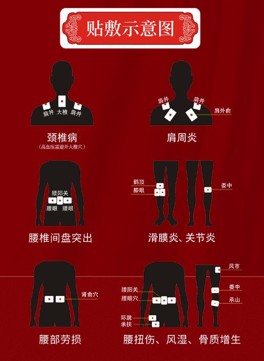 | 產(chǎn)品賣點(diǎn) | 腰扭傷、腰部勞損、肩周炎、風(fēng)濕、頸椎病,骨質(zhì)增生,滑膜炎,關(guān)節(jié)炎,腰椎間盤突出等人群使用Ⅲ型(頸肩腰痛貼)穴位貼、貼于對(duì)應(yīng)穴位處(詳見穴位圖)。 |