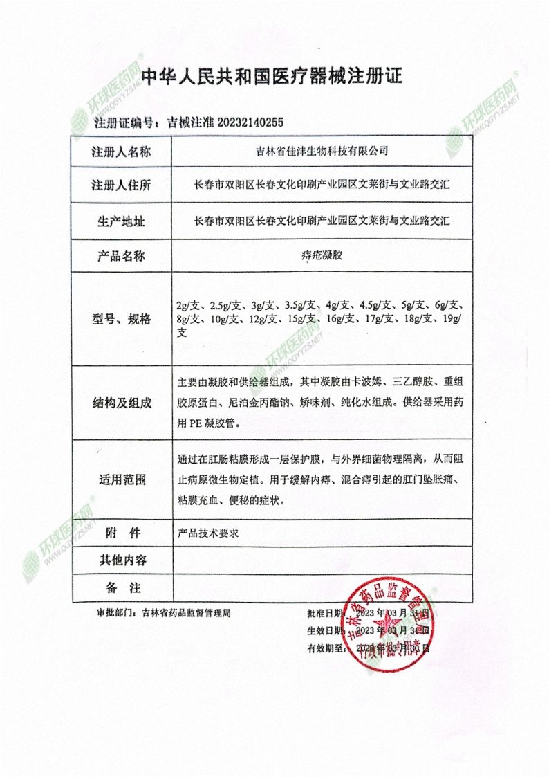 | 補充說明 | 【產(chǎn)品技術(shù)要求編號】吉械注準20232140255 【醫(yī)療器械注冊證編號】吉械注準20232140255 【生產(chǎn)許可證編號】 吉藥監(jiān)械生產(chǎn)許20230105號 【產(chǎn) 品 性 能 】1、外觀:供給器表面應(yīng)光滑,無鋒棱、無毛刺; 2、凝膠顏色為淡黃色至棕色、色澤均勻。 3、每100g中含羧酸基(-COOH)為0.20g-0.50g。 其他詳見產(chǎn)品技術(shù)要求。 【主要結(jié)構(gòu)組成】 痔瘡凝膠主要由凝膠和供給器組成,其中凝膠由卡波姆、三乙醇胺、重組膠原蛋白、尼泊金丙酯鈉、矯味劑、純化水組成。供給器采用藥用PE凝膠管。 【適用范圍】 通過在肛腸粘膜形成一層保護膜,與外界細菌物理隔離,從而阻止病原微生物定植。用于緩解內(nèi)痔、混合痔引起的肛門墜脹痛、粘膜充血、便秘的癥狀。 【使用方法】打開包裝,去掉供給器一端的保護帽,內(nèi)痔患者將供給器插入肛門,推至藥物達到患病部位;混合痔及肛裂患者推至藥物溢出涂抹即可。每天1次,每次1支,內(nèi)痔7天為一個療程。混合痔10天為一個療程。 【禁 忌 癥】 對本品過敏者禁用。 【注 冊 人、生產(chǎn)企業(yè)、售后服務(wù)單位】 吉林省佳灃生物科技有限公司 【使用期限】 三年 |