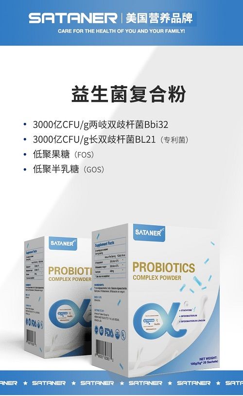| 補(bǔ)充說(shuō)明 | 產(chǎn)品名稱:益生菌復(fù)合粉 配料:低聚果糖、菊粉、低聚半乳糖、水蘇糖、兩歧雙歧桿菌、長(zhǎng)雙歧桿菌。 乳酸菌活菌數(shù)≥1.0X10"CFU/g 貯存條件:置于8℃以下陰涼干燥處。 沖調(diào)方法:取1袋,加入100毫升溫水(37℃以下),攪拌后飲用。 溫馨提示:本產(chǎn)品含有新資源食品菊粉20%低聚半乳糖20%。 菊粉每日食用限量≤15克/慶,低聚半乳糖每日食用限量s15克/慶。 凈含量:100克(20袋) 原產(chǎn)國(guó):美國(guó) 保質(zhì)期:36個(gè)月 |