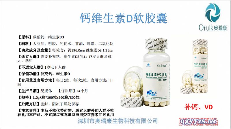 | 補(bǔ)充說(shuō)明 | 鈣維生素D軟膠囊 招商:熊--13045859985 鈣維生素D軟膠囊是以碳酸鈣、維生素D3 、大豆油、甘油、明膠、水、二氧化鈦為主要原料制成的保健食品,具有補(bǔ)充鈣及維生素D的功效。 【原料】碳酸鈣,維生素D3 【輔料】大豆油,明膠,純化水,甘油,蜂蠟,二氧化鈦 【功效成分及含量】每粒含:鈣196.0mg 維生素D3 1.25μg 【適宜人群】需要補(bǔ)充鈣、維生素D3的11-17歲人群及成人、孕婦 【不適宜人群】1歲以下人群 【保健功能】補(bǔ)充鈣、維生素D 【食用量及食用方法】每日2次,每次1粒,食用方法:口服 【生產(chǎn)日期】見(jiàn)噴碼 【保質(zhì)期】24個(gè)月 【規(guī)格】1.0g/粒 【貯藏方法】密封,陰涼干燥處保存 |