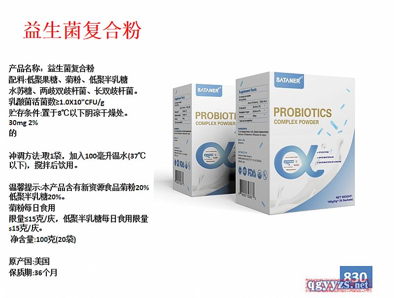 | 補(bǔ)充說(shuō)明 | 進(jìn)口益生菌復(fù)合粉 產(chǎn)品名稱:益生菌復(fù)合粉 配料:低聚果糖、菊粉、低聚半乳糖 水蘇糖、兩歧雙歧桿菌、長(zhǎng)雙歧桿菌。 乳酸菌活菌數(shù)≥1.0X10"CFU/g 原產(chǎn)國(guó):美國(guó) 保質(zhì)期:36個(gè)月 貯存條件:置于8℃以下陰涼干燥處。 30mg 2% 的 沖調(diào)方法:取1袋,加入100毫升溫水(37℃以下),攪拌后飲用。 溫馨提示:本產(chǎn)品含有新資源食品菊粉20%低聚半乳糖20%。 菊粉每日食用 限量≤15克/慶,低聚半乳糖每日食用限量s15克/慶。 凈含量:100克(20袋) 一天一袋,一盒可以服用20天。 美國(guó)原裝進(jìn)口益生菌粉,一天一袋,一盒可以服用20天。由美國(guó)原裝進(jìn)口,一般貿(mào)易,清關(guān)手續(xù)齊全。 |