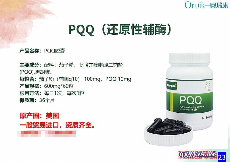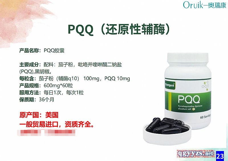 | 補充說明 | 產(chǎn)品名稱:PQQ膠囊 主要成分:配料:茄子粉,吡咯并喹啉醌二鈉鹽(PQQ),黑胡椒。 每粒含:茄子粉(輔酶q10) 100mg,PQQ 10mg 產(chǎn)品規(guī)格:600mg*60粒 服用方法:每日1次,每次1粒 保質(zhì)期:36個月 原產(chǎn)國:美國 一般貿(mào)易進口,資質(zhì)齊全。 |