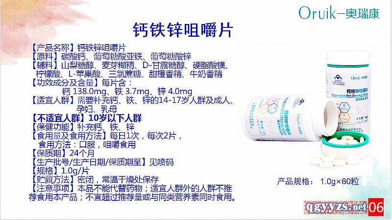 | 補充說明 | 【產(chǎn)品名】:鈣鐵鋅硒咀嚼片 招商電話:熊-13045859985 |
