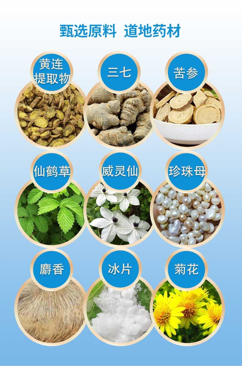 | 主要成分 | 本品是以黃連提取物、三七、苦參、仙鶴草、威靈仙、冰片、珍珠母、麝香、元明粉、硼砂、菊花等為主要原料,經(jīng)特定工藝加工而成。 |