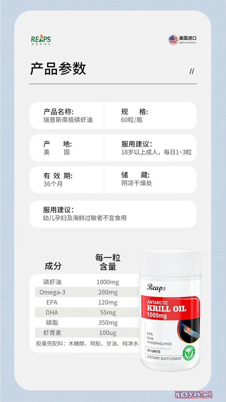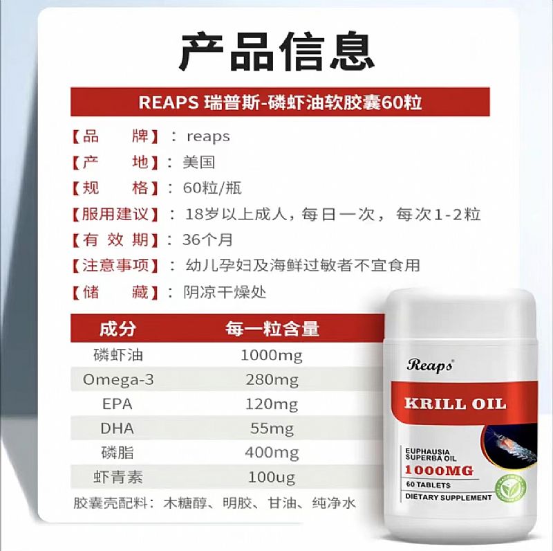 | 補(bǔ)充說明 | 產(chǎn)品名稱:南極磷蝦油軟膠囊(1000毫克) 主要成分:磷蝦油、木糖醇、明膠、甘油、純凈水。 每粒添加磷蝦油1000毫克、其中含磷脂 400毫克、DHA 55毫克、EPA 120毫克。 產(chǎn)品規(guī)格:1400mgX60粒 服用方法:每日2-3粒 保質(zhì)期:36個(gè)月 原產(chǎn)國:美國 一般貿(mào)易進(jìn)口,資質(zhì)齊全。 |