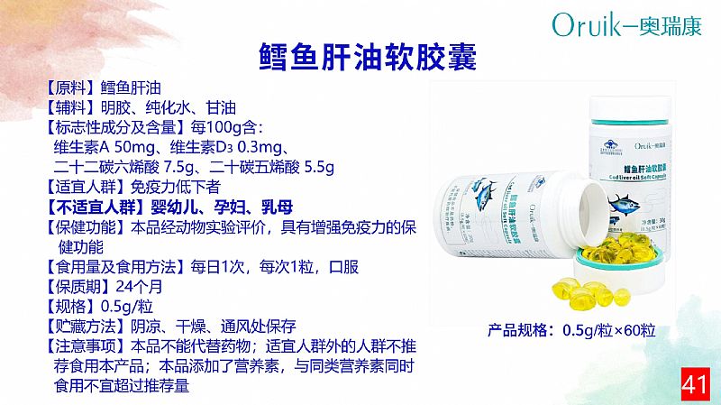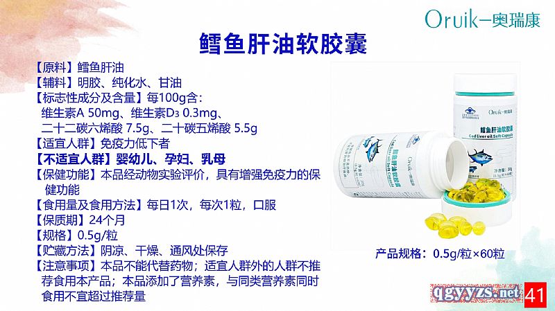 | 作用機(jī)理 | 【標(biāo)志性成分及含量】每100g含:維生素A50mg、維生素D30.3mg、二十二碳六烯酸7.5g、二十碳五烯酸5.5g |