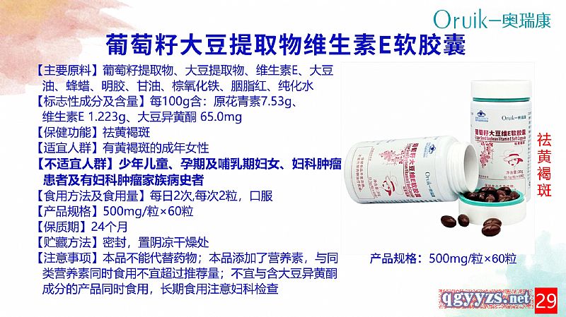| 補充說明 | 【原料】葡萄籽提取物、大豆提取物、維生素E(dl-ɑ-生育酚醋酸酯) 【輔料】大豆油、明膠、純化水、甘油、蜂蠟、二氧化鈦、紫氧化鐵 【標(biāo)志性成分及含量】每100g含:原花青素5.0g、大豆異黃酮 1.5g、大豆苷0.6g、染料木苷0.9g、維生素E 3.52g 【保健功能】祛黃褐斑 【適宜人群】有黃褐斑的成年女性 【不適宜人群】少年兒童、孕婦、乳母、婦科腫瘤患者及有婦科腫瘤家族病史者 【食用量及食用方法】每日2次,每次2粒,口服 【保 質(zhì) 期】24個月 【生產(chǎn)批號/生產(chǎn)日期/保質(zhì)期至】見包裝物具體部位 【規(guī)格】0.5g/粒 【貯藏方法】避光、密閉,置陰涼干燥處 【注意事項】本品不能代替藥物;適宜人群外的人群不推薦食用本產(chǎn)品;本品添加了營養(yǎng)素,與同類營養(yǎng)素同時食用不宜超過推薦量;不宜與含大豆異黃酮成分的產(chǎn)品同時食用,長期食用注意婦科檢查 |