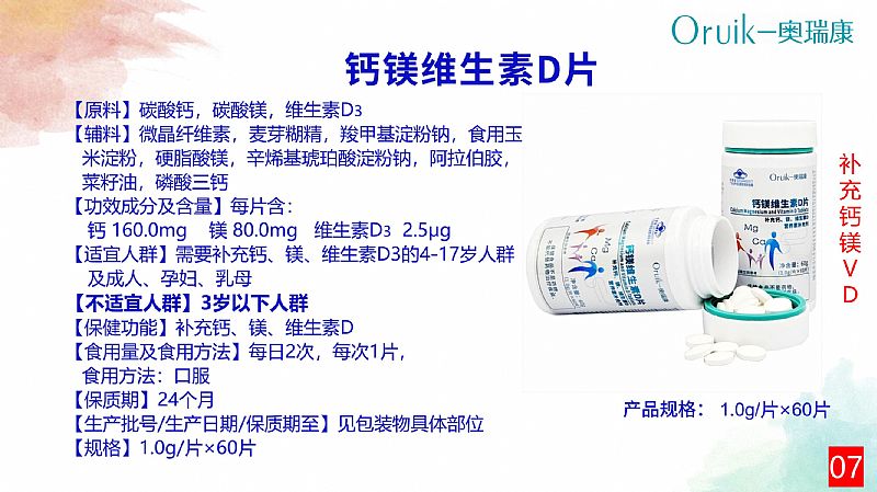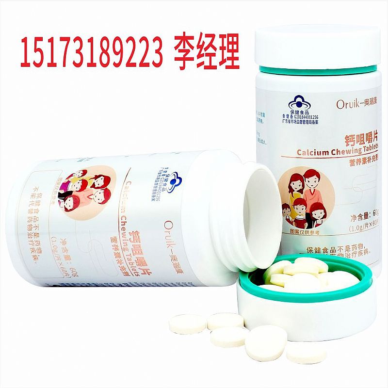 | 補充說明 | 【原料】碳酸鈣 【輔料】山梨糖醇,麥芽糊精,乳粉,D-甘露糖醇,預膠化淀粉,硬脂酸鎂,三氯蔗糖,甜橙香精,牛奶香精 【功效成分及含量】每片含:鈣 138mg 【適宜人群】需要補充鈣的4-17歲人群及成人、孕婦、乳母 【不適宜人群】3歲以下人群 【保健功能】補充鈣 【食用量及食用方法】每日1次,每次2片,食用方法:口服,咀嚼食用 【保質期】24個月 【生產批號/生產日期/保質期至】見噴碼 【規(guī)格】1.0g/片 【貯藏方法】密封,常溫干燥處保存 【注意事項】本品不能代替藥物。適宜人群外的人群不推薦食用本產品。不宜超過推薦量或與同類營養(yǎng)素同時食用 |