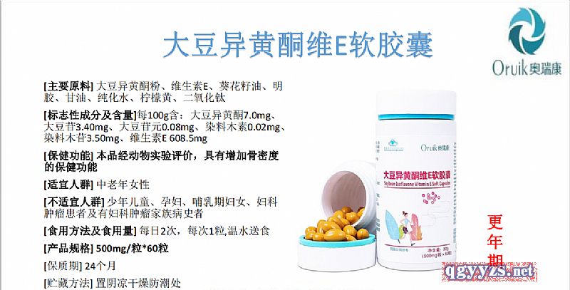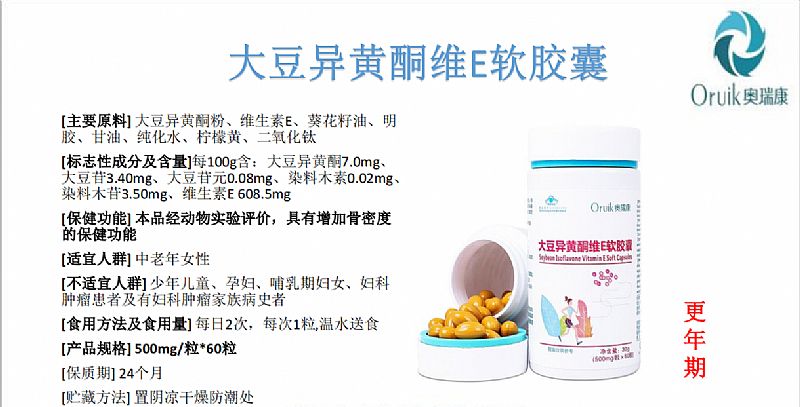 | 補(bǔ)充說(shuō)明 | [主要原料] 大豆異黃酮粉、維生素E、葵花籽油、明膠、甘油、純化水、檸檬黃、二氧化鈦 [標(biāo)志性成分及含量]每100g含:大豆異黃酮7.0mg、大豆苷3.40mg、大豆苷元0.08mg、染料木素0.02mg、染料木苷3.50mg、維生素E 608.5mg [保健功能] 本品經(jīng)動(dòng)物實(shí)驗(yàn)評(píng)價(jià),具有增加骨密度的保健功能 [適宜人群] 中老年女性 [不適宜人群] 少年兒童、孕婦、哺乳期婦女、婦科腫瘤患者及有婦科腫瘤家族病史者 [食用方法及食用量] 每日2次,每次1粒,溫水送食 [產(chǎn)品規(guī)格] 500mg/粒×60粒 [保質(zhì)期] 24個(gè)月 [貯藏方法] 置陰涼干燥防潮處 |