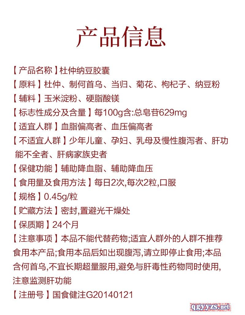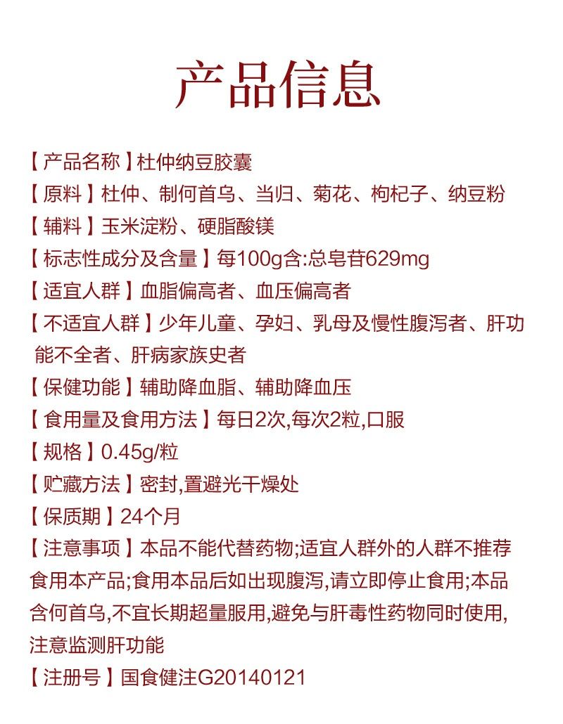 | 產(chǎn)品名稱 | 杜仲納豆膠囊(輔助降血壓功效) |