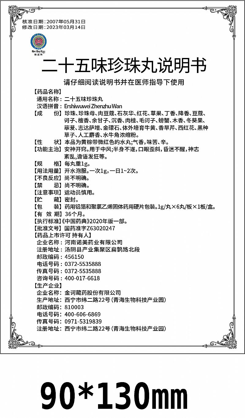 通用名稱: 二十五味珍珠丸