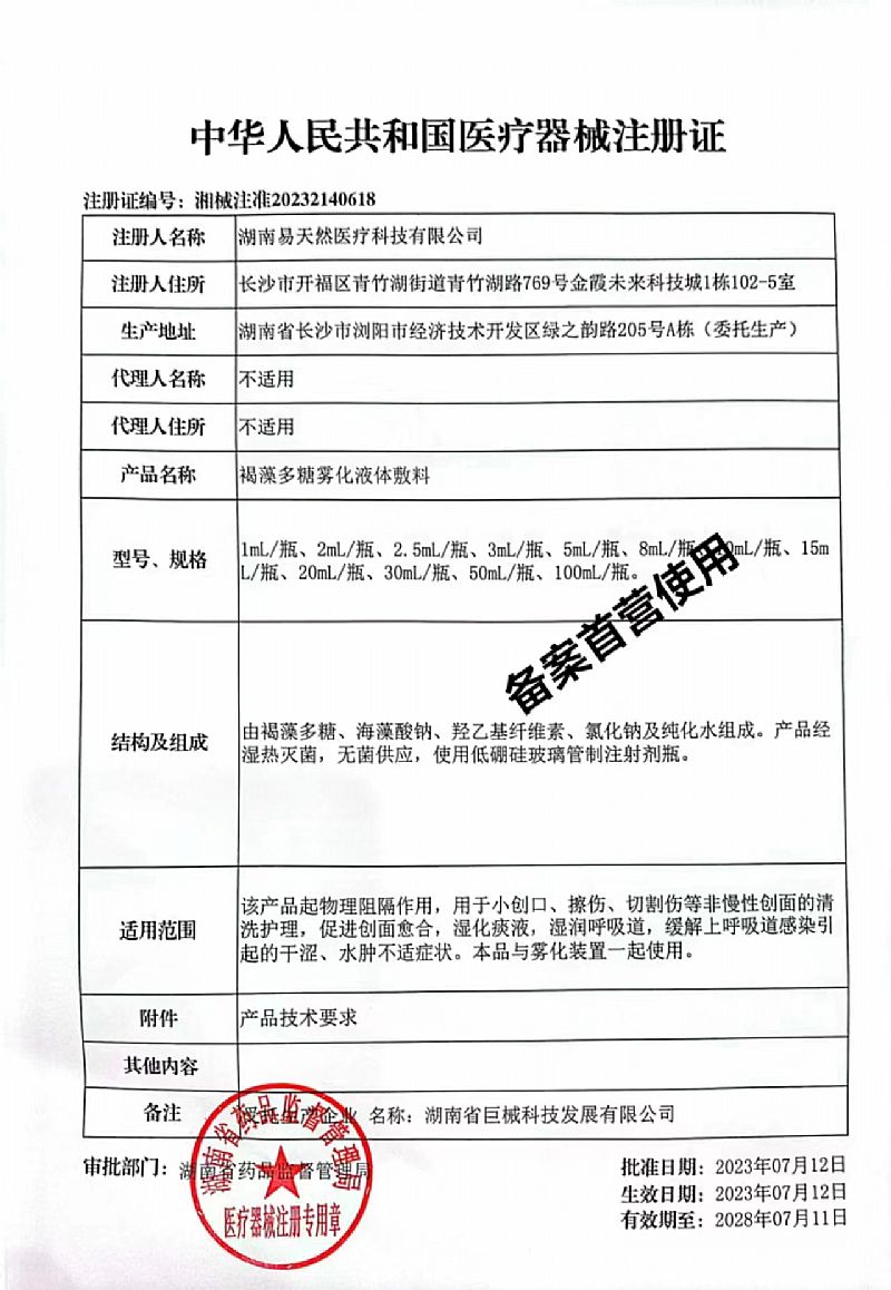 | 產(chǎn)品名稱 | 美舒坦-褐藻多糖霧化液體敷料 |