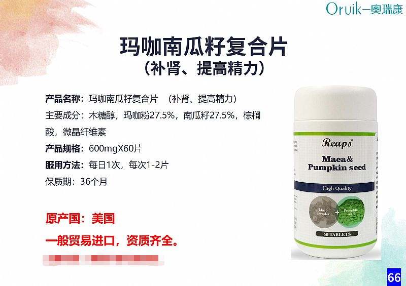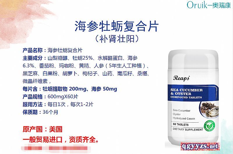 | 補充說明 | 產(chǎn)品名稱:海參牡蠣復(fù)合片 主要成分:山梨糖醇、牡蠣25%、水解酪蛋白、海參6.3%、番茄粉、瑪咖粉、黃精、人參(5年生人工種植)、黑芝麻、白果粉、胡蘿卜、枸杞子、山藥、南瓜籽、桑椹、微晶纖維素, 每片含:牡蠣提取物 200mg、海參 50mg 產(chǎn)品規(guī)格:600mgX60片 服用方法:每日1次,每次1-2片 保質(zhì)期:36個月 原產(chǎn)國:美國 一般貿(mào)易進口,資質(zhì)齊全。 |