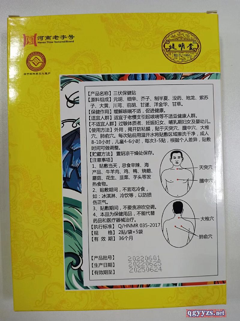 | 補(bǔ)充說(shuō)明 | 不適宜人群:過(guò)敏體質(zhì)者,妊娠婦女,哺乳期婦女及嬰幼兒。 儲(chǔ)藏方法:置陰涼干燥處保存 注意事項(xiàng): 1、貼敷當(dāng)天忌食辛辣,海產(chǎn)品,牛羊肉,雞鴨花生、韭菜、等發(fā)物 2、貼敷期間不宜吃冷食 3、不要貪涼吹空調(diào) 4、本品為保健用品 ,不能代替藥品和醫(yī)療器械治療 |