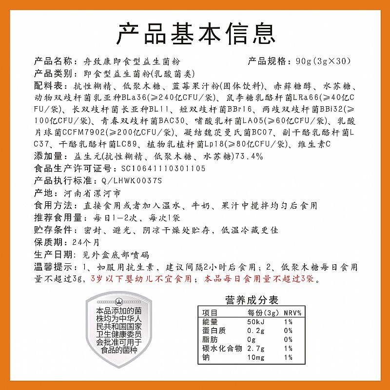 | 補(bǔ)充說明 | 食用方法:直接食用或者加入溫水、牛奶、果汁中攪拌均勻后食用。 推薦食用量:每日1-2次,每次1袋 貯存條件:密封、避光、陰涼干燥處貯存,低溫冷藏更佳 保質(zhì)期:24個(gè)月 溫馨提示:1、如服用抗生素,建議間隔2小時(shí)后食用;2、低聚木糖每日食用量不超過3g,嬰幼兒不宜食用;本品每日食用量不超過3袋。 |
