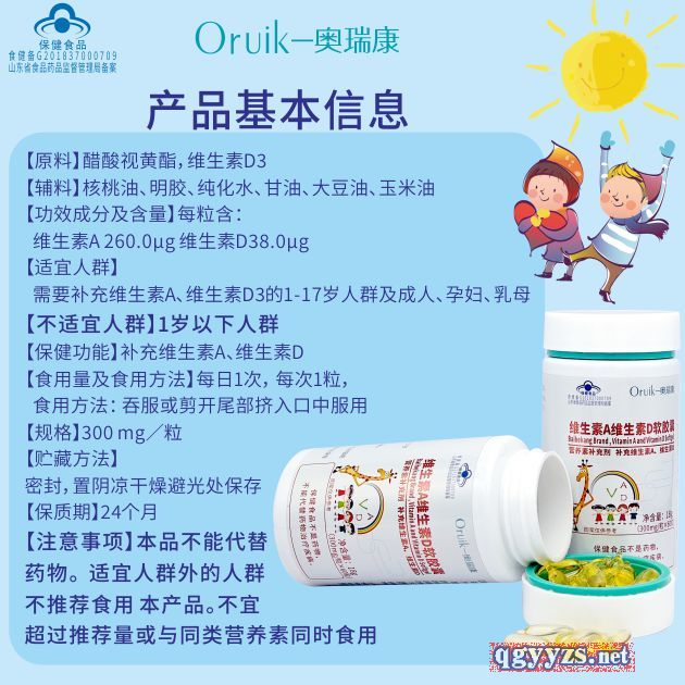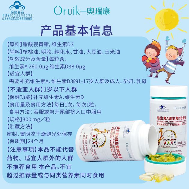 | 補(bǔ)充說明 | 【原料】醋酸視黃酯,維生素D3 【輔料】核桃油、明膠、純化水、甘油、大豆油、玉米油 【功效成分及含量】每粒含:維生素A 260.0μg 維生素D38.0μg 【適宜人群】需要補(bǔ)充維生素A、維生素D3的1-17歲人群及成人、孕婦、乳母 【不適宜人群】1歲以下人群 【保健功能】補(bǔ)充維生素A、維生素D 【食用量及食用方法】每日1次, 每次1粒, 食用方法: 吞服或剪開尾部擠入口中服用 【規(guī)格】300 mg/!60粒 【貯藏方法】密封,置陰涼干燥避光處保存 【保質(zhì)期】24個(gè)月 【注意事項(xiàng)】本品不能代替藥物。 適宜人群外的人群不推薦食用本產(chǎn)品。不宜超過推薦量或與同類營養(yǎng)素同時(shí)食用 |