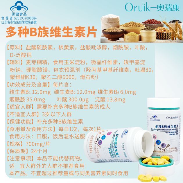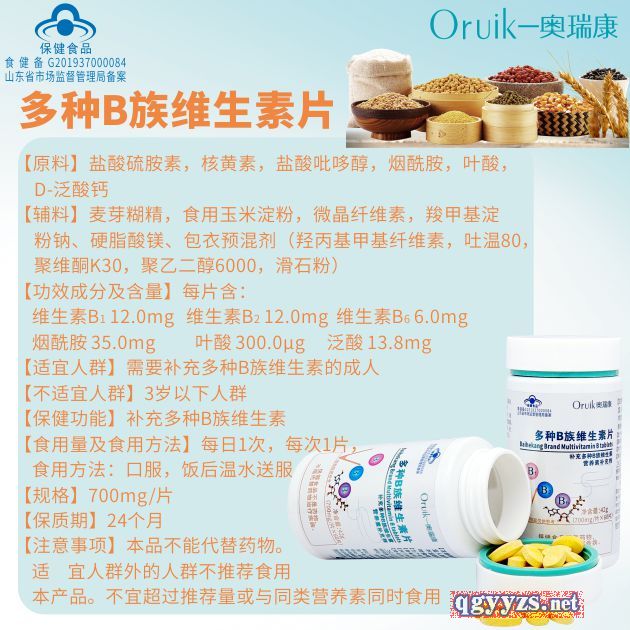 | 補(bǔ)充說明 | 【原料】鹽酸硫胺素,核黃素,鹽酸吡哆醇,煙酰胺,葉酸,D-泛酸鈣 【輔料】麥芽糊精,食用玉米淀粉,微晶纖維素,羧甲基淀粉鈉、硬脂酸鎂、包衣預(yù)混劑(羥丙基甲基纖維素,吐溫80,聚維酮K30,聚乙二醇6000,滑石粉) 【功效成分及含量】每片含: 維生素B1 12.0mg 維生素B2 12.0mg 維生素B6 6.0mg 煙酰胺 35.0mg 葉酸 300.0μg 泛酸 13.8mg 【適宜人群】需要補(bǔ)充多種B族維生素的成人 【不適宜人群】3歲以下人群 【保健功能】補(bǔ)充多種B族維生素 【食用量及食用方法】每日1次,每次1片,食用方法:口服,飯后溫水送服 【規(guī)格】700mg/片 【貯藏方法】密封,陰涼干燥處保存 【保質(zhì)期】24個月 【注意事項(xiàng)】本品不能代替藥物。適宜人群外的人群不推薦食用本產(chǎn)品。不宜超過推薦量或與同類營養(yǎng)素同時食用 |