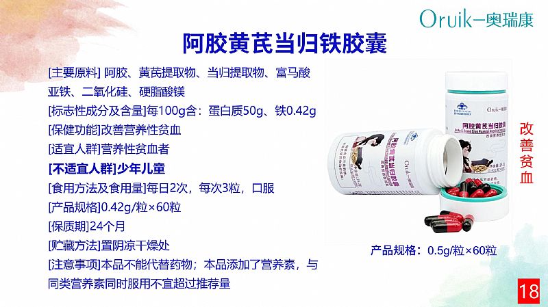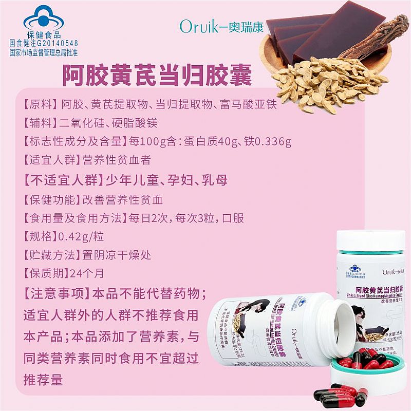 | 補充說明 | 【原料】 阿膠、黃芪提取物、當歸提取物、富馬酸亞鐵 【輔料】二氧化硅、硬脂酸鎂 【標志性成分及含量】每100g含:蛋白質(zhì)40g、鐵0.336g 【適宜人群】營養(yǎng)性貧血者 【不適宜人群】少年兒童、孕婦、乳母 【保健功能】改善營養(yǎng)性貧血 【食用量及食用方法】每日2次,每次3粒,口服 【規(guī)格】0.42g/粒 【貯藏方法】置陰涼干燥處 【保質(zhì)期】24個月 【注意事項】本品不能代替藥物;適宜人群外的人群不推薦食用本產(chǎn)品;本品添加了營養(yǎng)素,與同類營養(yǎng)素同時食用不宜超過推薦量 |
