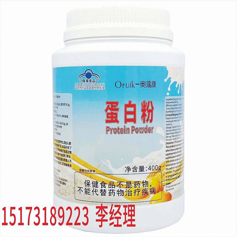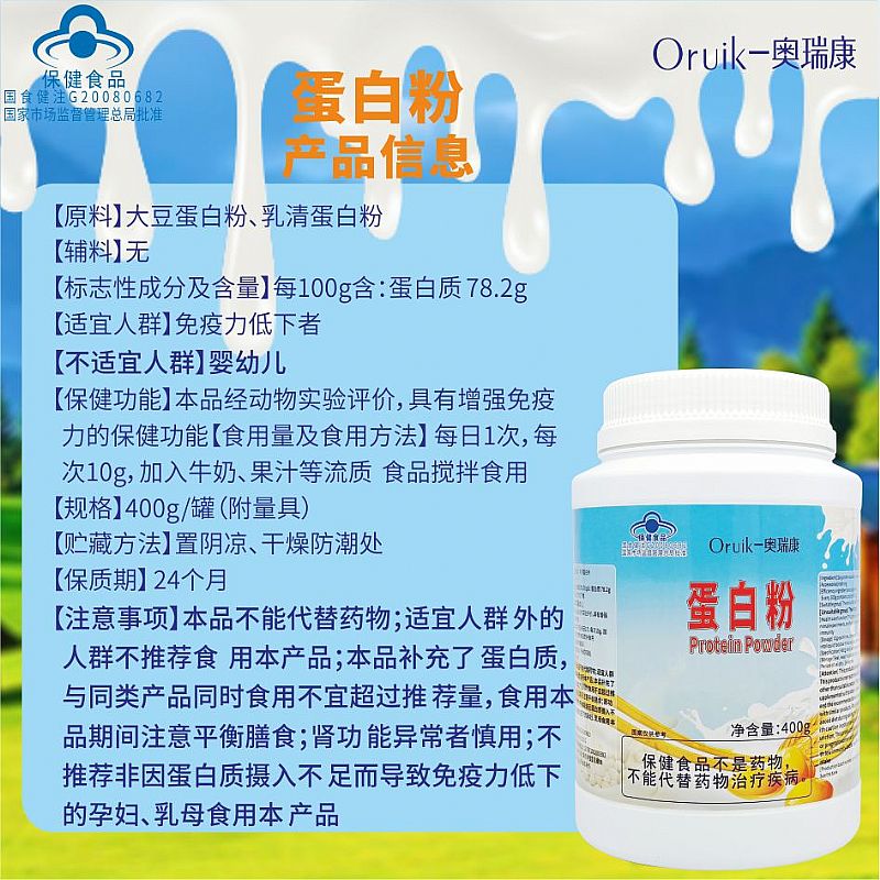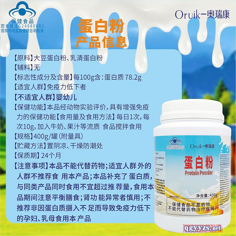 | 補充說明 | 【原料】大豆蛋白粉、乳清蛋白粉 【輔料】無 【標志性成分及含量】每100g含:蛋白質 78.2g 【適宜人群】免疫力低下者 【不適宜人群】嬰幼兒 【保健功能】本品經動物實驗評價,具有增強免疫力的保健功能 【食用量及食用方法】 每日1次,每次10g,加入牛奶、果汁等流質食品攪拌食用 【規(guī)格】400g/罐(附量具) 【貯藏方法】置陰涼、干燥防潮處 【保質期】 24個月 【注意事項】本品不能代替藥物;適宜人群 外的人群不推薦食用本產品;本品補充了 蛋白質,與同類產品同時食用不宜超過推 薦量,食用本品期間注意平衡膳食;腎功 能異常者慎用;不推薦非因蛋白質攝入不足而導致免疫力低下的孕婦、乳母食用本產品 |