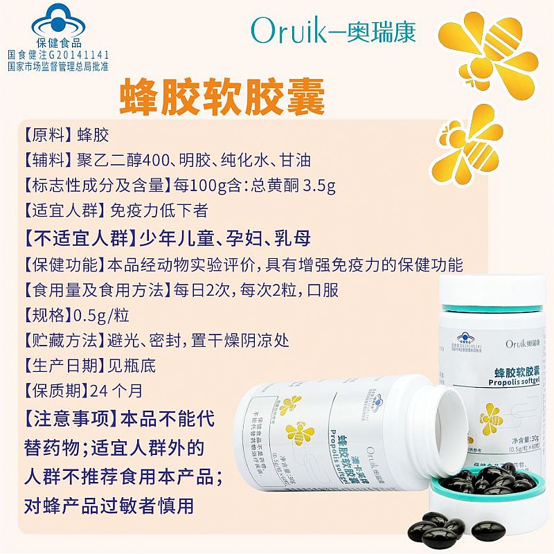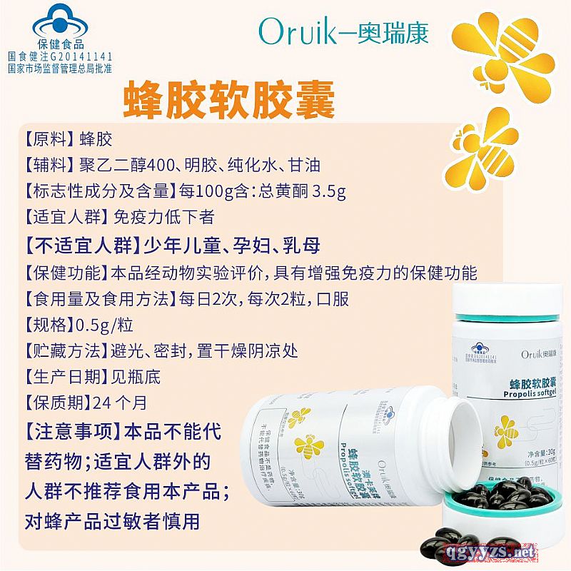 | 補(bǔ)充說明 | 【原料】 蜂膠 【輔料】 聚乙二醇400、明膠、純化水、甘油 【標(biāo)志性成分及含量】每100g含:總黃酮 3.5g 【適宜人群】 免疫力低下者 【不適宜人群】少年兒童、孕婦、乳母 【保健功能】本品經(jīng)動(dòng)物實(shí)驗(yàn)評(píng)價(jià),具有增強(qiáng)免疫力的保健功能 【食用量及食用方法】每日2次,每次2粒,口服 【規(guī)格】0.5g/粒 【貯藏方法】避光、密封,置干燥陰涼處 【生產(chǎn)日期】見瓶底 【保質(zhì)期】24 個(gè)月 【注意事項(xiàng)】本品不能代替藥物;適宜人群外的人群不推薦食用本產(chǎn)品;對(duì)蜂產(chǎn)品過敏者慎用 |