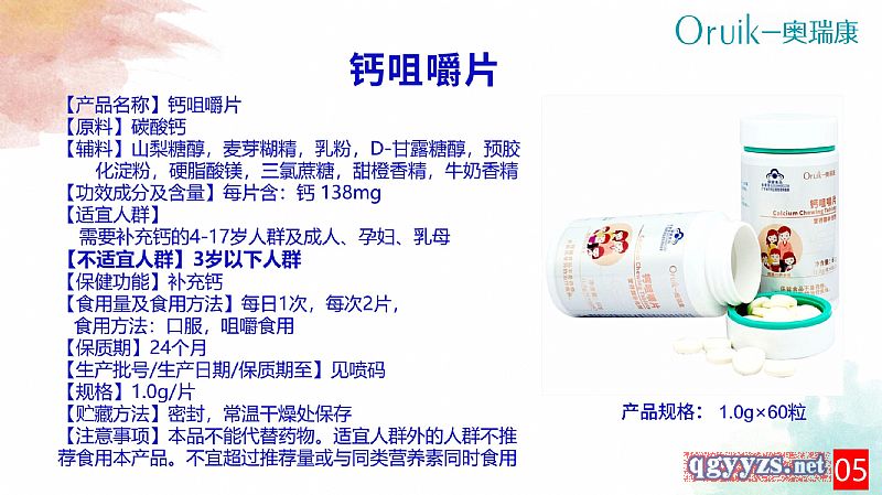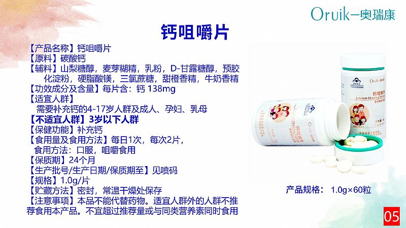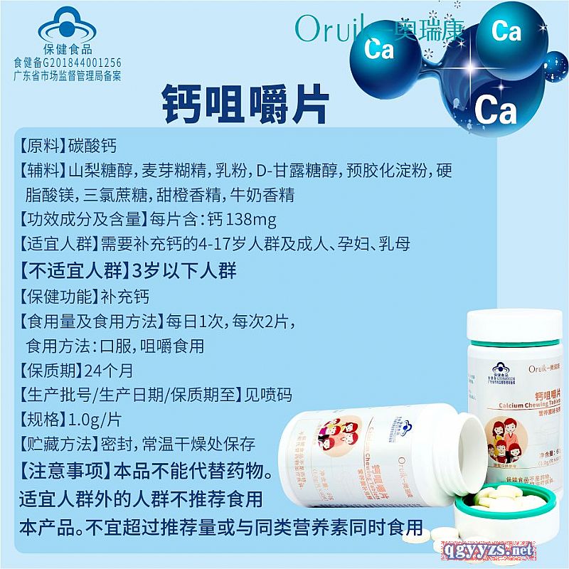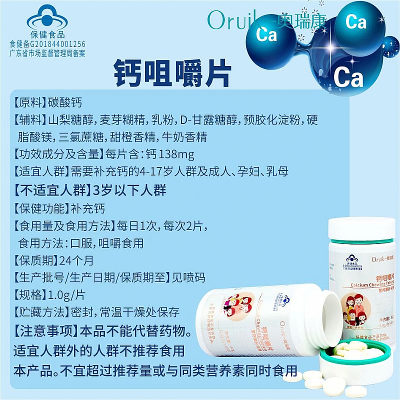 | 補(bǔ)充說明 | 【原料】碳酸鈣 【輔料】山梨糖醇,麥芽糊精,乳粉,D-甘露糖醇,預(yù)膠化淀粉,硬脂酸鎂,三氯蔗糖,甜橙香精,牛奶香精 【功效成分及含量】每片含:鈣 138mg 【適宜人群】需要補(bǔ)充鈣的4-17歲人群及成人、孕婦、乳母 【不適宜人群】3歲以下人群 【保健功能】補(bǔ)充鈣 【食用量及食用方法】每日1次,每次2片,食用方法:口服,咀嚼食用 【保質(zhì)期】24個月 【生產(chǎn)批號/生產(chǎn)日期/保質(zhì)期至】見噴碼 【規(guī)格】1.0g/片 【貯藏方法】密封,常溫干燥處保存 【注意事項(xiàng)】本品不能代替藥物。適宜人群外的人群不推薦食用本產(chǎn)品。不宜超過推薦量或與同類營養(yǎng)素同時食用 |
