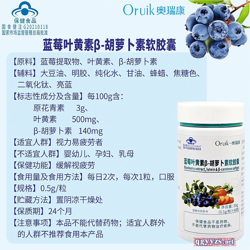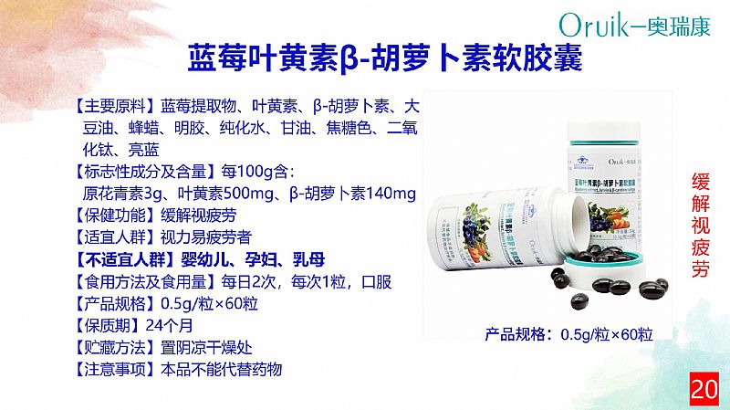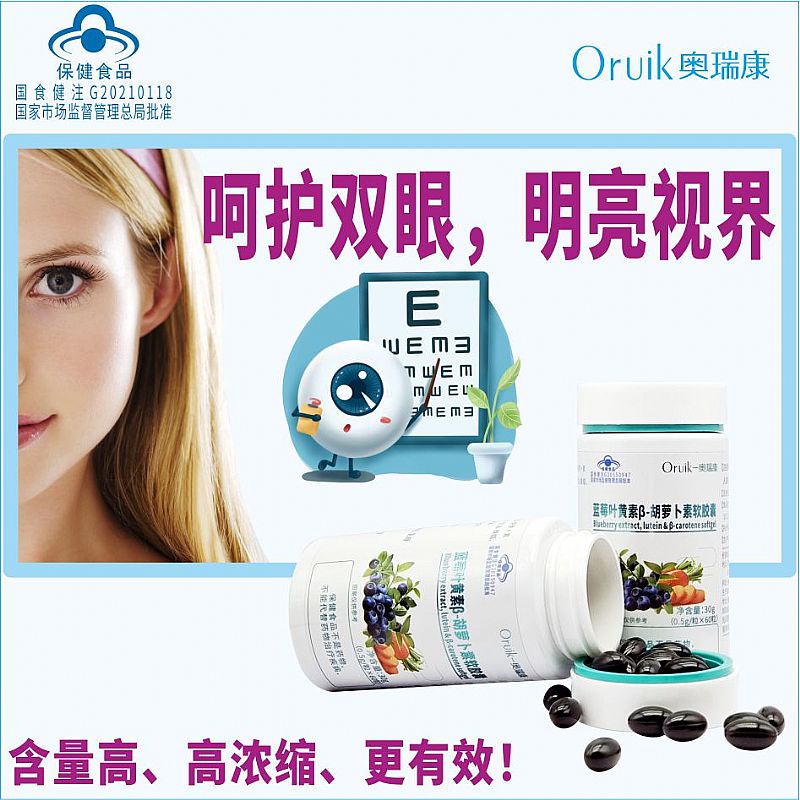 | 補(bǔ)充說(shuō)明 | 【原料】藍(lán)莓提取物、葉黃素、β-胡蘿卜素 【輔料】大豆油、明膠、純化水、甘油、蜂蠟、焦糖色、二氧化鈦、亮藍(lán) 【標(biāo)志性成分及含量】每100g含:原花青素3g、葉黃素 500mg、β-胡蘿卜素140mg 【適宜人群】視力易疲勞者 【不適宜人群】嬰幼兒、孕婦、乳母 【保健功能】緩解視疲勞 【食用量及食用方法】每日2次,每次1粒,口服 【規(guī)格】0.5g/粒 【貯藏方法】置陰涼干燥處 【保質(zhì)期】24個(gè)月 【注意事項(xiàng)】本品不能代替藥物;適宜人群外的人群不推薦食用本產(chǎn)品 |
