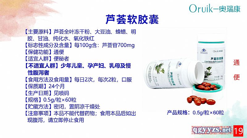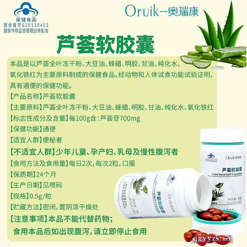 | 補充說明 | 【主要原料】蘆薈全葉凍干粉、大豆油、蜂蠟、明膠、甘油、純化水、氧化鐵紅 【標志性成分及含量】每100g含:蘆薈苷700mg 【保健功能】通便 【適宜人群】便秘者 【不適宜人群】少年兒童、孕產(chǎn)婦、乳母及慢性腹瀉者 【食用方法及食用量】每日2次,每次2粒,口服 【保質(zhì)期】24個月 【生產(chǎn)日期】見噴碼 【規(guī)格】0.5g/粒 【貯藏方法】密閉,置陰涼干燥處 【注意事項】本品不能代替藥物;食用本品后如出現(xiàn)腹瀉,請立即停止食用 |