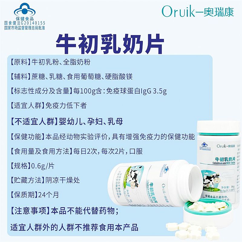 | 補(bǔ)充說(shuō)明 | 【原料】牛初乳粉、全脂奶粉 【輔料】蔗糖、乳糖、食用葡萄糖、硬脂酸鎂 【標(biāo)志性成分及含量】每100g含:免疫球蛋白IgG 3.5g 【適宜人群】免疫力低下者 【不適宜人群】嬰幼兒、孕婦、乳母 【保健功能】本品經(jīng)動(dòng)物實(shí)驗(yàn)評(píng)價(jià),具有增強(qiáng)免疫力的保健功能 【食用量及食用方法】每日2次,每次2片,口服 【規(guī)格】0.6g/片 【貯藏方法】陰涼干燥處 【保質(zhì)期】24個(gè)月 【注意事項(xiàng)】本品不能代替藥物;適宜人群外的人群不推薦食用本產(chǎn)品 |