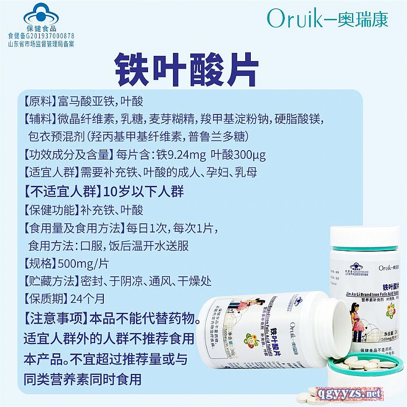 | 補(bǔ)充說(shuō)明 | 【原料】富馬酸亞鐵,葉酸 【輔料】微晶纖維素,乳糖,麥芽糊精,羧甲基淀粉鈉,硬脂酸鎂,包衣預(yù)混劑(羥丙基甲基纖維素,普魯蘭多糖) 【功效成分及含量】 每片含:鐵9.24mg 葉酸300μg 【適宜人群】需要補(bǔ)充鐵、葉酸的成人、孕婦、乳母 【不適宜人群】10歲以下人群 【保健功能】補(bǔ)充鐵、葉酸 【食用量及食用方法】每日1次,每次1片,食用方法:口服,飯后溫開(kāi)水送服 【規(guī)格】500mg/片 【貯藏方法】密封、于陰涼、通風(fēng)、干燥處 【保質(zhì)期】 24個(gè)月 【注意事項(xiàng)】本品不能代替藥物。適宜人群外的人群不推薦食用本產(chǎn)品。不宜超過(guò)推薦量或與同類(lèi)營(yíng)養(yǎng)素同時(shí)食用 |
