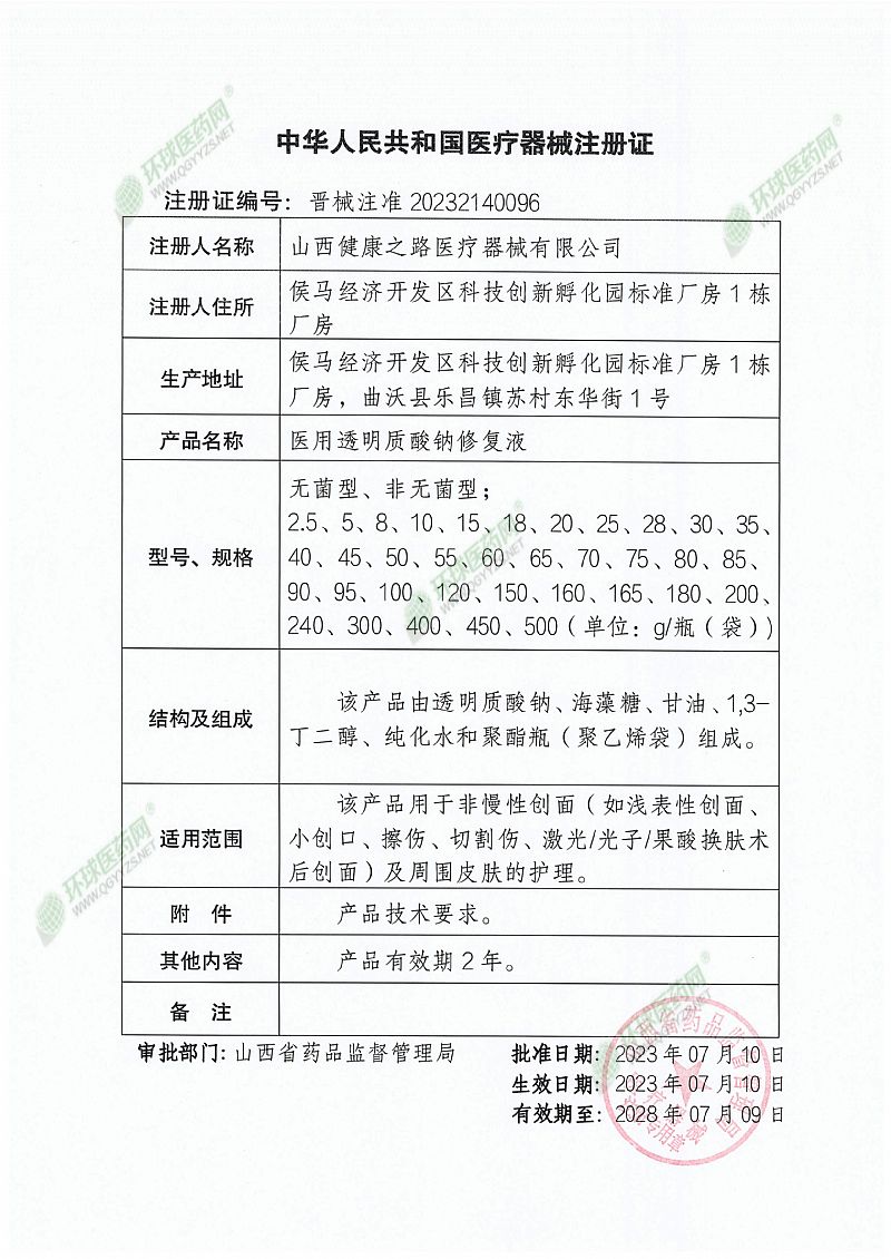 | 補(bǔ)充說明 | 【產(chǎn)品名稱】醫(yī)用透明質(zhì)酸鈉修復(fù)液 【型號(hào)、規(guī)格】 型號(hào):無菌型、非無菌型; 規(guī)格:2.5g、5g、8g、10g、15g、18g、20g、25g、28g、30g、35g、40g、45g、50g、55g、60g、65g、70g、75g、80g、85g、90g、95g、100g、120g、150g、160g、165g、180g、200g、240g、300g、400g、450g、500g/瓶(袋)。 【結(jié)構(gòu)及組成】 該產(chǎn)品由透明質(zhì)酸鈉、海藻糖、甘油、1,3-丁二醇、純化水和聚酯瓶(聚乙烯袋)組成。 【產(chǎn)品性能】pH值范圍為5.0-7.5。 【適用范圍】該產(chǎn)品用于非慢性創(chuàng)面(如淺表性創(chuàng)面、小創(chuàng)口、擦傷、切割傷、激光/光子/果酸換膚術(shù)后創(chuàng)面)及周圍皮膚的護(hù)理。 【使用方法】外用。清潔患處皮膚,取本品外敷于患處。 【禁 忌 癥】 1、對(duì)外用透明質(zhì)酸鈉類制品,以及本品成分過敏者禁用。 2、痤瘡合并嚴(yán)重感染和膿皰者在炎癥未得到有效控制前不得使用。 3、本產(chǎn)品在醫(yī)生指導(dǎo)下應(yīng)用于開放性傷口及燒、燙傷,如出現(xiàn)不適,請(qǐng)立即停止使用或遵醫(yī)囑。 4、嬰幼兒、孕婦慎用。 【注意事項(xiàng)】 (1)本品較少出現(xiàn)過敏反應(yīng),一旦出現(xiàn)過敏反應(yīng),應(yīng)停用本品。 (2)本品僅供外用,不得內(nèi)服。 (3)本品經(jīng)滅菌處理,使用前確認(rèn)包裝是否完整,如遇破損,切勿使用。 (4)切勿直接接觸眼睛,如接觸眼睛,請(qǐng)用大量清水沖洗。 (5)本品性狀發(fā)生改變時(shí)禁止使用。 (6)使用前請(qǐng)閱讀說明書,在產(chǎn)品有效期內(nèi)使用,超過有效期禁止使用。 (7)使用后的產(chǎn)品按照醫(yī)院規(guī)定或環(huán)保要求處理。 (8)開封后30天內(nèi)使用。 【儲(chǔ)存方法】應(yīng)貯存在陰涼干燥處,避免陽光直射。 【運(yùn)輸】產(chǎn)品在運(yùn)輸過程中應(yīng)避免日曬、雨淋及重壓。 【配件清單】醫(yī)用透明質(zhì)酸鈉修復(fù)液、說明書 【有效期】二年 【生產(chǎn)日期/生產(chǎn)批號(hào)/滅菌批號(hào)】見外包裝 【醫(yī)療器械生產(chǎn)許可證編號(hào)】晉藥監(jiān)械生產(chǎn)許20200012號(hào) 【醫(yī)療器械注冊(cè)證編號(hào)】晉械注準(zhǔn)20232140096 【醫(yī)療器械產(chǎn)品技術(shù)要求編號(hào)】晉械注準(zhǔn)20232140096 【注冊(cè)人名稱/生產(chǎn)企業(yè)】山西健康之路醫(yī)療器械有限公司 【注冊(cè)人住所/生產(chǎn)企業(yè)住所】侯馬經(jīng)濟(jì)開發(fā)區(qū)科技創(chuàng)新孵化園標(biāo)準(zhǔn)廠房1棟廠房 【生產(chǎn)地址】侯馬經(jīng)濟(jì)開發(fā)區(qū)科技創(chuàng)新孵化園標(biāo)準(zhǔn)廠房1棟廠房,曲沃縣樂昌鎮(zhèn)蘇村東華街1號(hào) |