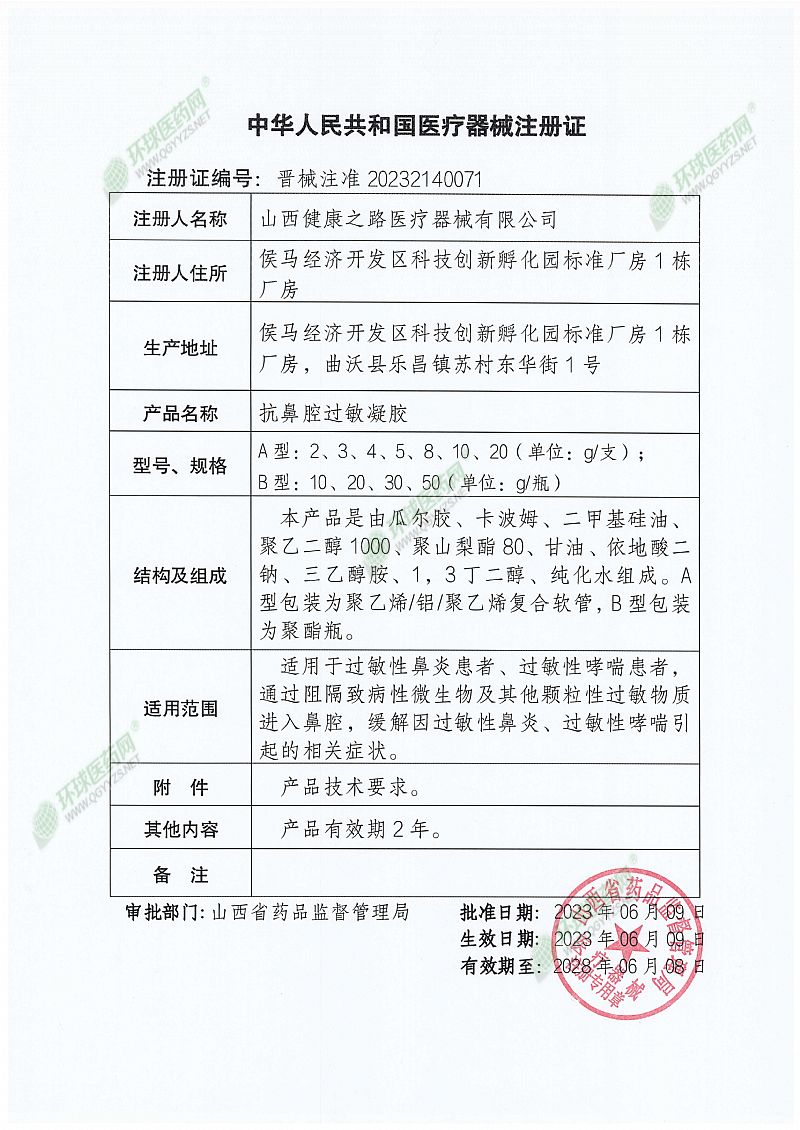 | 補充說明 | 【產(chǎn)品名稱】抗鼻腔過敏凝膠 【型號、規(guī)格】A型: 2g/支、3g/支、4g/支、5g/支、8g/支、10g/支、20g/支; B型:10g/瓶、20g/瓶、30g/瓶、50g/瓶。 【結(jié)構(gòu)及組成】本產(chǎn)品是由瓜爾膠、卡波姆、二甲基硅油、聚乙二醇1000、聚山梨酯80、甘油、依地酸二鈉、三乙醇胺、1,3丁二醇、純化水組成。A型包裝為聚乙烯/鋁/聚乙烯復(fù)合軟管,B型包裝為聚酯瓶。 【適用范圍】適用于過敏性鼻炎患者、過敏性哮喘患者,通過阻隔致病性微生物及其他顆粒性過敏物質(zhì)進入鼻腔,緩解因過敏性鼻炎、過敏性哮喘引起的相關(guān)癥狀。 【產(chǎn)品性能】pH值范圍為6.0-8.0;重金屬含量(以Pb2+計)應(yīng)不大于10ug/g;動力黏度:20℃±1℃時≥50Pa·s;微生物限度:需氧菌總數(shù)(cfu/g)≤102,霉菌和酵母菌總數(shù)(cfu/g)≤101,大腸埃希菌(1g)不得檢出,金黃色葡萄球菌(1g)不得檢出,銅綠假單胞菌(1g)不得檢出。 【使用方法】 1.使用本產(chǎn)品之前,應(yīng)清潔鼻腔,去除鼻腔內(nèi)的附著物。 2.A型:將本品直接擠在鼻前庭部位(鼻腔前部、鼻翼內(nèi)面),約黃豆大小。使用棉簽將其均勻涂抹于鼻孔周圍及鼻腔內(nèi)黏膜,大約涂抹到外鼻翼的高度。 B型:擠出約黃豆大小凝膠,用棉簽均勻涂于鼻孔周圍及鼻腔內(nèi)黏膜,大約涂抹到外鼻翼的高度。 3. 在涂抹好本品之后即可用鼻正常呼吸,每日3-5次,可根據(jù)需要多次使用。 【禁忌癥】 對本品成分過敏、鼻部皮膚潰破、急性化膿性鼻竇炎者禁用。鼻腔大面積創(chuàng)傷者禁用;顒有员浅鲅蚣韧妆浅鲅呱饔谩 【注意事項】 1.使用前請認真閱讀說明書; 2.本品嚴禁吞食;請勿過度使用,以免產(chǎn)生不良反應(yīng); 3.如有刺激或發(fā)疹現(xiàn)象,請以清水沖洗,并停止使用。 4.鑒于本產(chǎn)品的物理阻隔作用機理,目前為止,暫未發(fā)現(xiàn)與其他藥物的相互作用。 如需與其他治療方法聯(lián)合使用,請向您的醫(yī)生或藥劑師進行咨詢; 5.使用過程中有任何不適癥狀,請立即停用,并向您的醫(yī)生或藥劑師進行咨詢; 6.本品為鼻腔黏膜用,為防鼻腔堵塞,嚴禁過量使用; 7.未成年應(yīng)在醫(yī)師指導(dǎo)下謹慎使用; 8.本品開封后請在一個月內(nèi)使用。 9.避免接觸眼睛,如果不慎入眼,請用大量清水沖洗。 【儲存方法】應(yīng)貯存在通風(fēng)干燥處,無腐蝕性氣體和通風(fēng)良好的室內(nèi)。 【運輸】產(chǎn)品在運輸過程中應(yīng)避免日曬、雨淋及重壓。 【配件清單】抗鼻腔過敏凝膠、說明書。 【有 效 期】二年 【生產(chǎn)日期/生產(chǎn)批號】見外包裝 【醫(yī)療器械生產(chǎn)許可證編號】晉藥監(jiān)械生產(chǎn)許20200012號 【醫(yī)療器械注冊證編號】晉械注準(zhǔn)20232140071 【醫(yī)療器械產(chǎn)品技術(shù)要求編號】晉械注準(zhǔn)20232140071 【注冊人名稱/生產(chǎn)企業(yè)】山西健康之路醫(yī)療器械有限公司 【注冊人住所/生產(chǎn)企業(yè)住所】侯馬經(jīng)濟開發(fā)區(qū)科技創(chuàng)新孵化園標(biāo)準(zhǔn)廠房1棟廠房 |