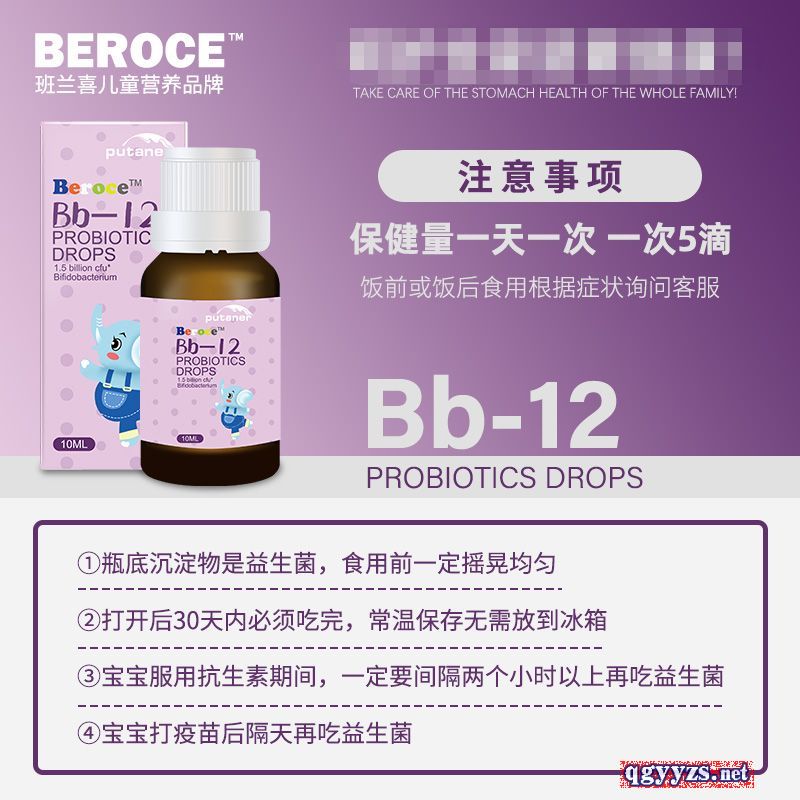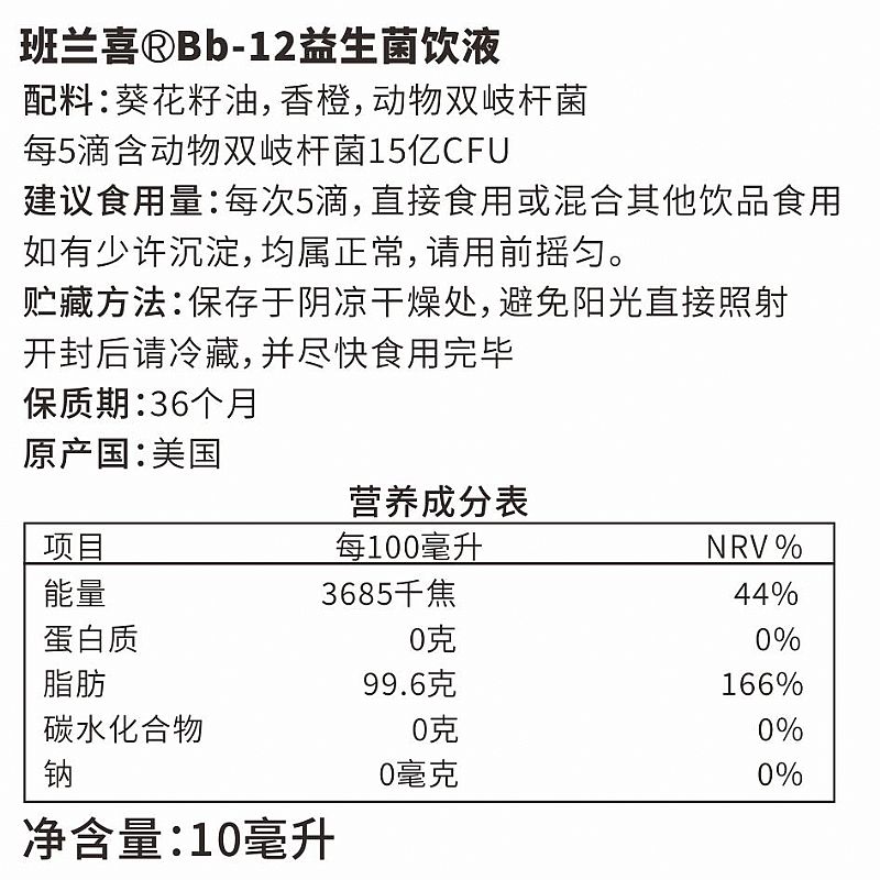 | 補(bǔ)充說明 | Bb-12益生菌飲液 配料:葵花籽油,香橙,動物雙岐桿菌 每5滴含動物雙岐桿菌15億CFU 建議食用量:每次5滴,直接食用或混合其他飲品食用 如有少許沉淀,均屬正常,請用前搖勻。 貯藏方法:保存于陰涼干燥處,避免陽光直接照射 開封后請冷藏,并盡快食用完畢 保質(zhì)期:36個(gè)月 原產(chǎn)國:美國 |