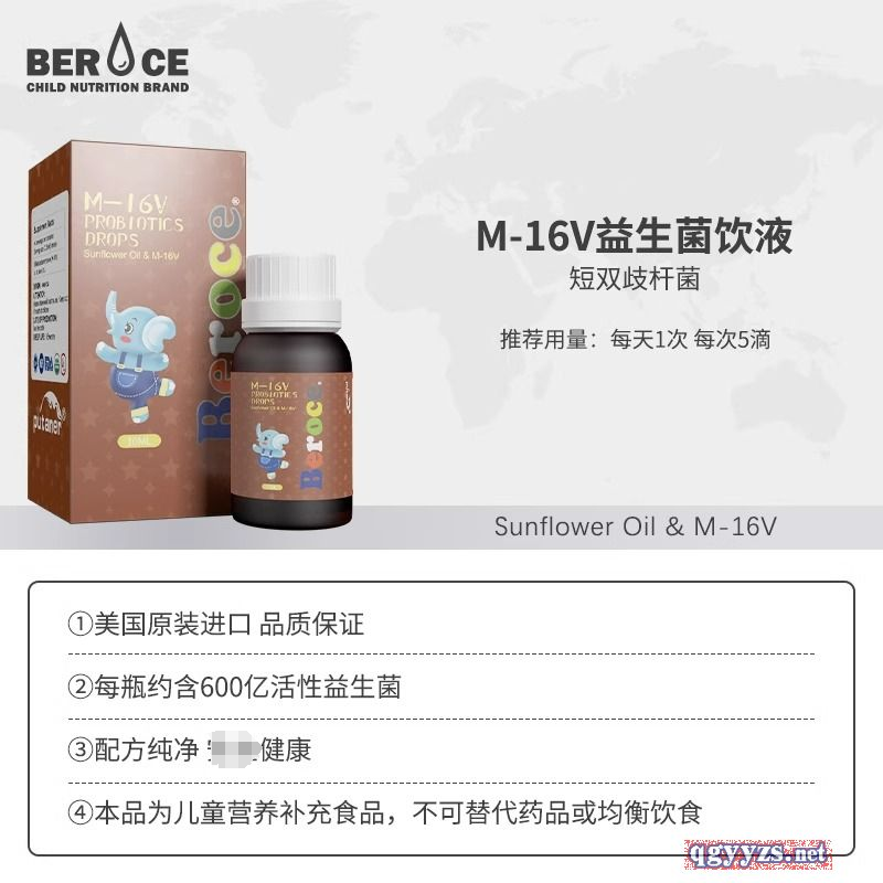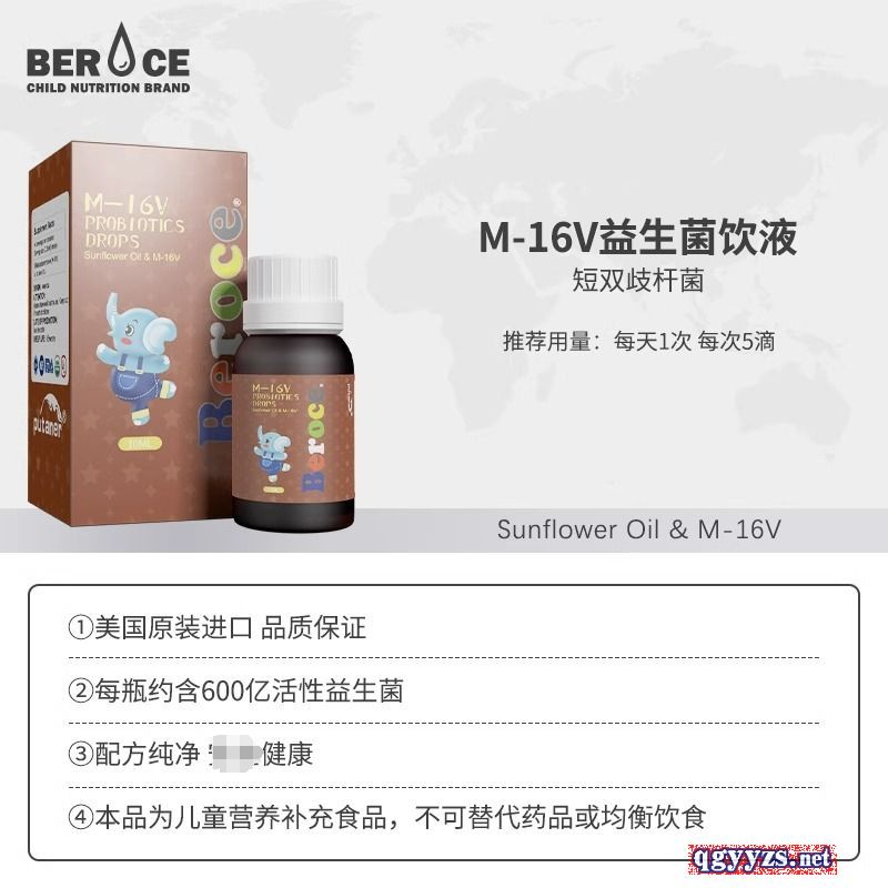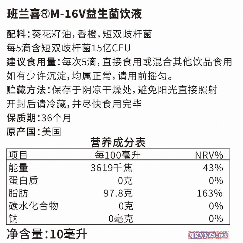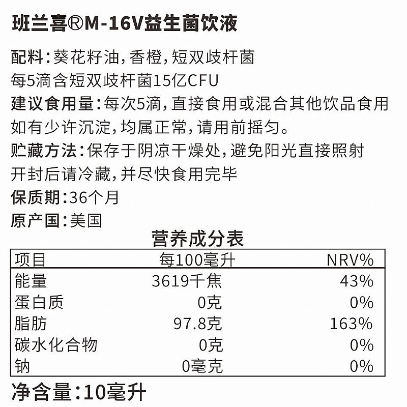 | 補(bǔ)充說明 | M-16V益生菌飲液 配料:葵花籽油,香橙,短雙歧桿菌 每5滴含短雙歧桿菌15億CFU 建議食用量:每次5滴,直接食用或混合其他飲品食用 如有少許沉淀,均屬正常,請用前搖勻。 貯藏方法:保存于陰涼干燥處,避免陽光直接照射 開封后請冷藏,并盡快食用完畢 保質(zhì)期:36個月 原產(chǎn)國:美國 |