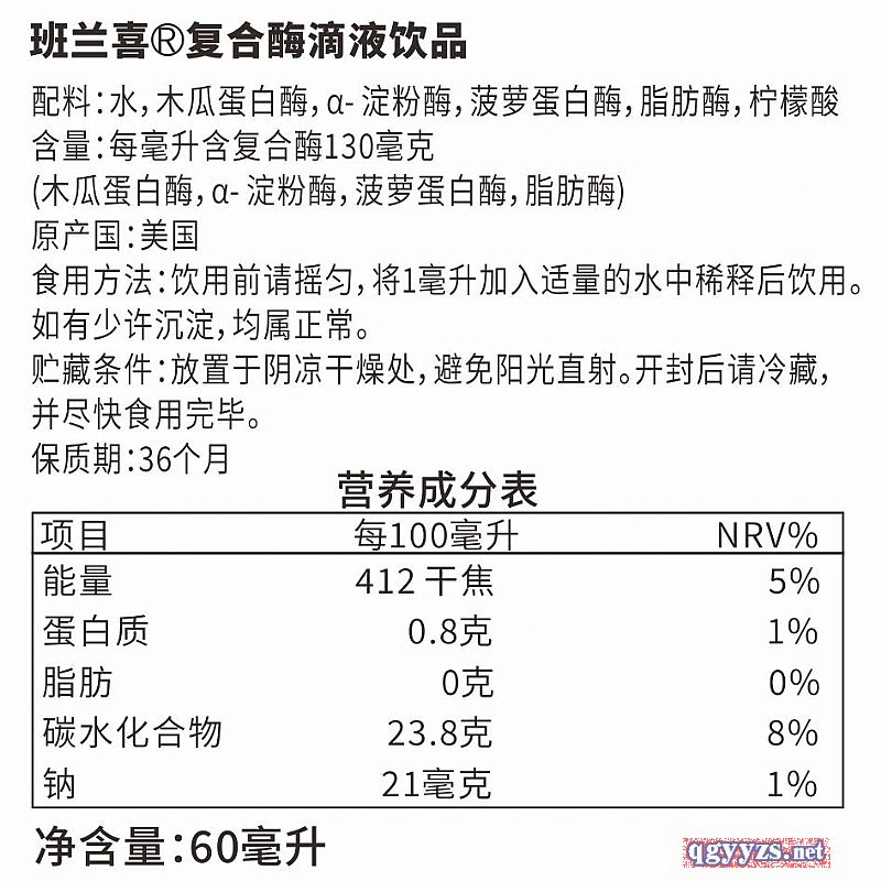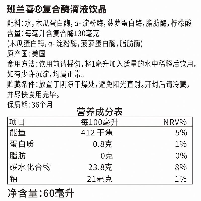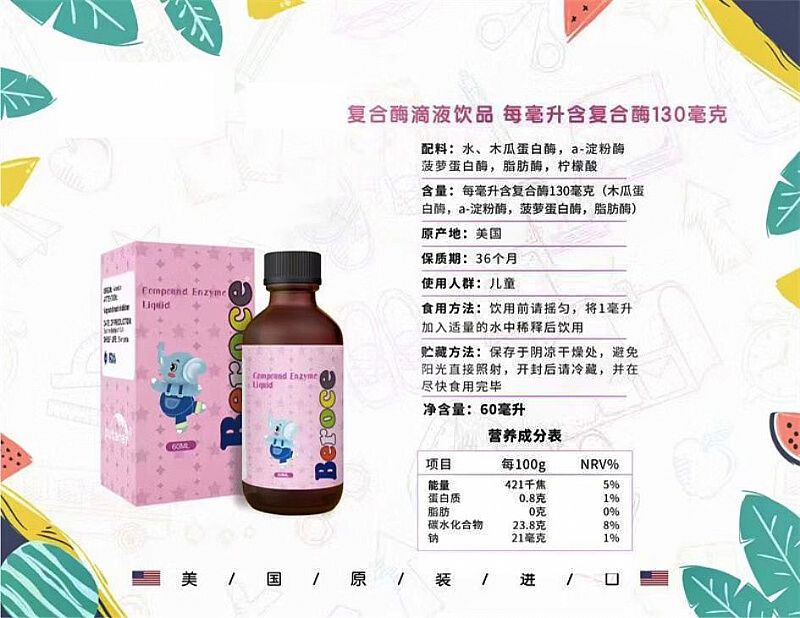 | 補(bǔ)充說明 | 復(fù)合酶滴液飲品 配料:水,木瓜蛋白酶,α- 淀粉酶,菠蘿蛋白酶,脂肪酶,檸檬酸 含量:每毫升含復(fù)合酶130毫克 (木瓜蛋白酶,α- 淀粉酶,菠蘿蛋白酶,脂肪酶) 原產(chǎn)國:美國 食用方法:飲用前請搖勻,將1毫升加入適量的水中稀釋后飲用。 如有少許沉淀,均屬正常。 貯藏條件:放置于陰涼干燥處,避免陽光直射。開封后請冷藏, 并盡快食用完畢。 保質(zhì)期:36個月 |