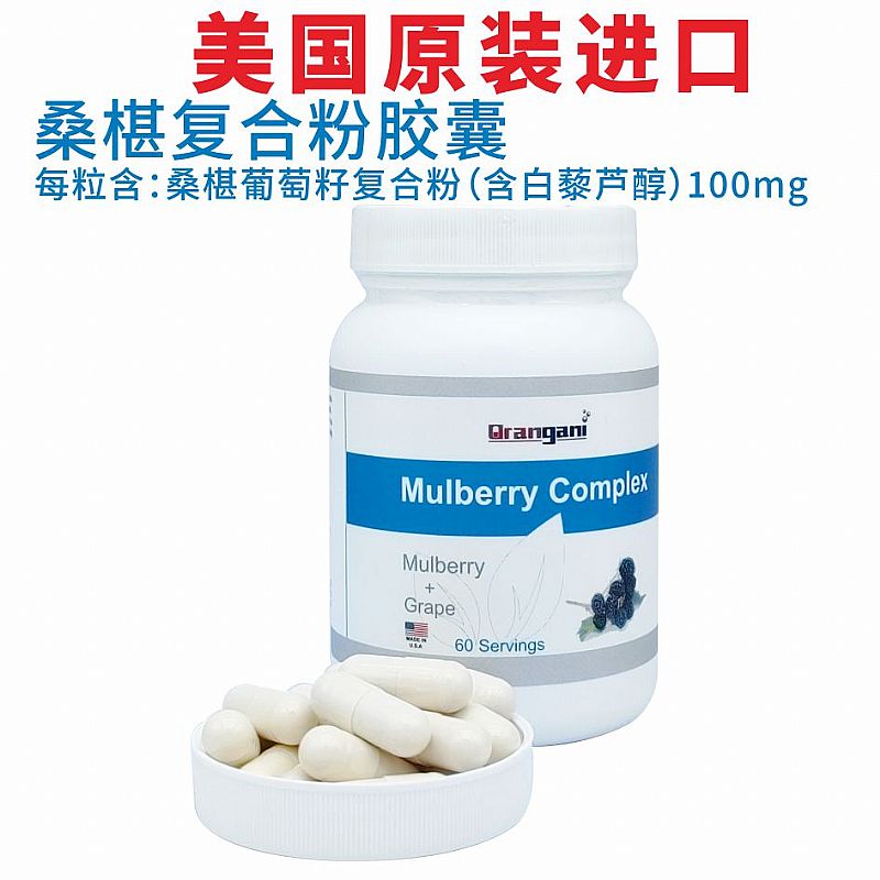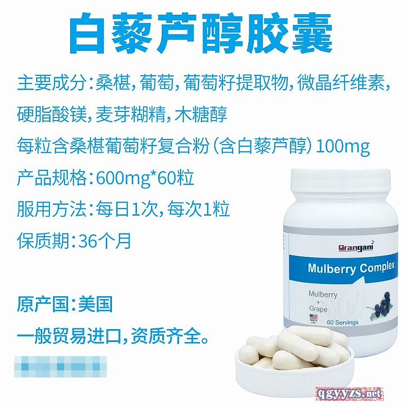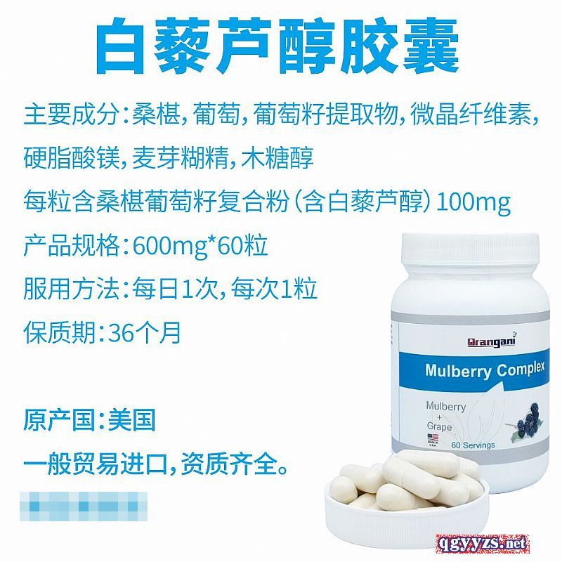 | 作用機(jī)理 | 每粒含桑椹葡萄籽復(fù)合粉(含白藜蘆醇)100mg |