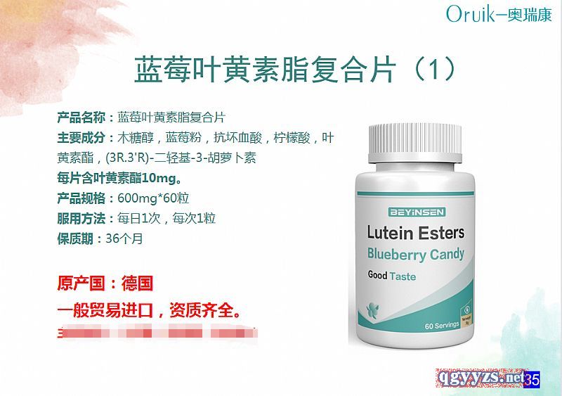 | 補(bǔ)充說(shuō)明 | 產(chǎn)品名稱(chēng):藍(lán)莓葉黃素脂復(fù)合片 主要成分:木糖醇,藍(lán)莓粉,抗壞血酸,檸檬酸,葉黃素酯,(3R.3'R)-二輕基-3-胡蘿卜素 每片含葉黃素酯10mg。 產(chǎn)品規(guī)格:600mg*60粒 服用方法:每日1次,每次1粒 保質(zhì)期:36個(gè)月 原產(chǎn)國(guó):德國(guó) 一般貿(mào)易進(jìn)口,資質(zhì)齊全。 |
