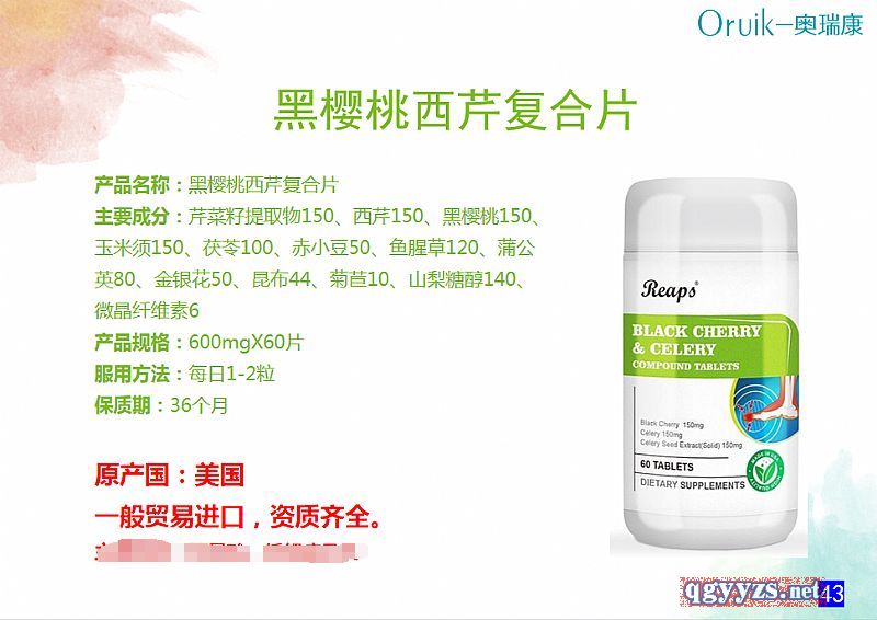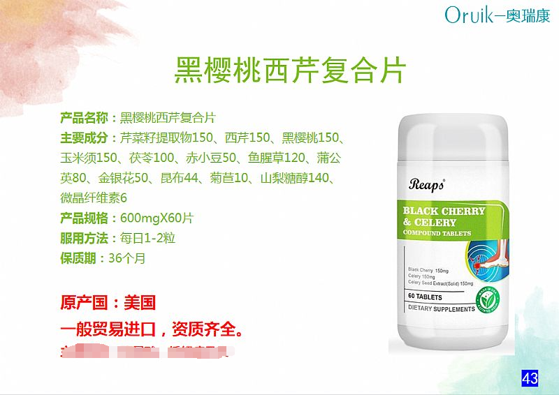 | 補充說明 | 產(chǎn)品名稱:黑櫻桃西芹復合片 主要成分:芹菜籽提取物150、西芹150、黑櫻桃150、玉米須150、茯苓100、赤小豆50、魚腥草120、蒲公英80、金銀花50、昆布44、菊苣10、山梨糖醇140、微晶纖維素6 產(chǎn)品規(guī)格:600mgX60片 服用方法:每日1-2粒 保質(zhì)期:36個月 |