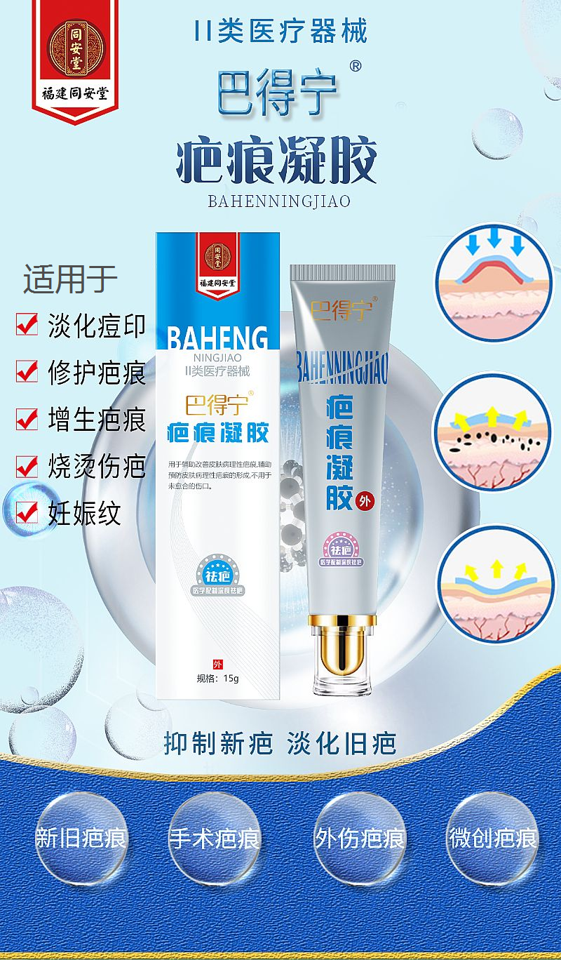 | 使用方法 | 使用前清潔患病部位皮膚表面,打開包裝,取適量疤痕修復凝膠涂抹在疤痕部位,輕揉5-10分鐘,每日3-4次;對于陳舊性疤痕或硬疤痕可適當增加次數(shù)。 |