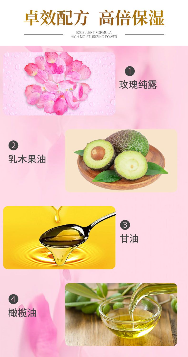 | 主要成分 | 玫瑰純露、乳木果油、馬油、甘油、橄欖油、丁二醇、角鯊?fù)椤ⅥL蠟硬脂醇、海藻多糖、VC乙基醚、維生素E.透明質(zhì)酸鈉、純化水、醋酸氯己定。 |